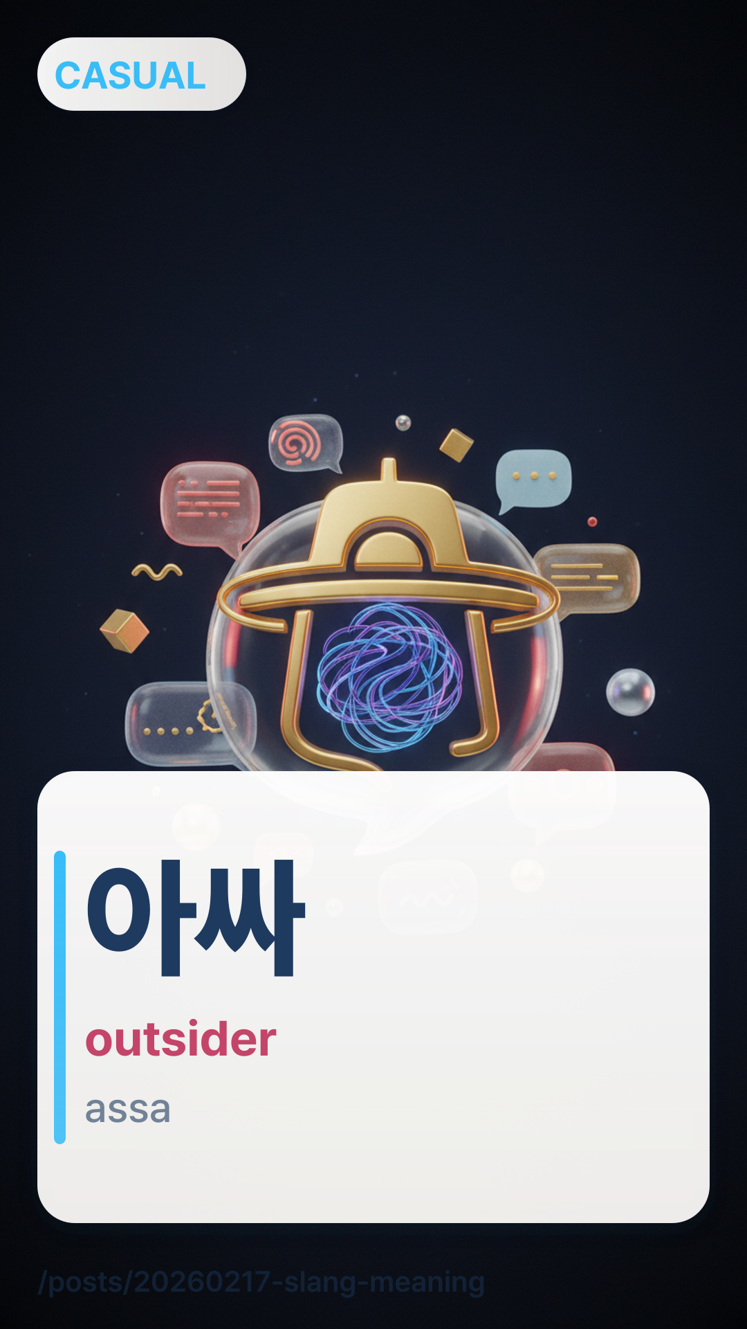 아싸assa adalah singkatan dari kata bahasa Inggris "Outsider" (아웃사이더). Ini merujuk pada seseorang yang tidak cocok dengan lingkungan, lebih suka sendirian, atau canggung secara sosial. Meskipun dulunya sedikit negatif, banyak orang sekarang menggunakannya untuk merendah guna menggambarkan gaya hidup introvert mereka.