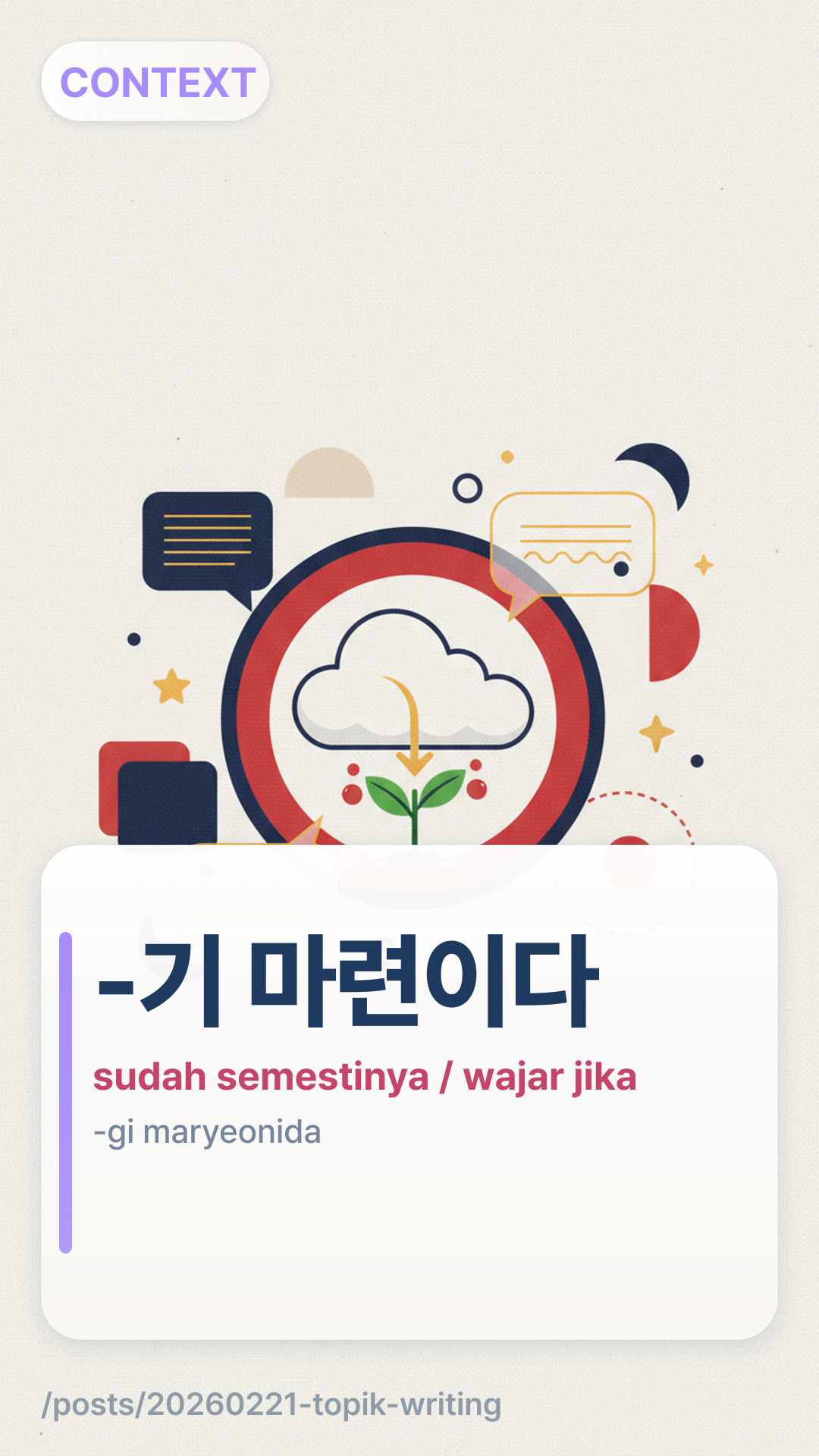 Kuasai tata bahasa TOPIK II -기 마련이다 untuk menjelaskan hukum alam dan hasil yang tak terelakkan. Pelajari perbedaannya dengan -게 뻔하다 di sini.