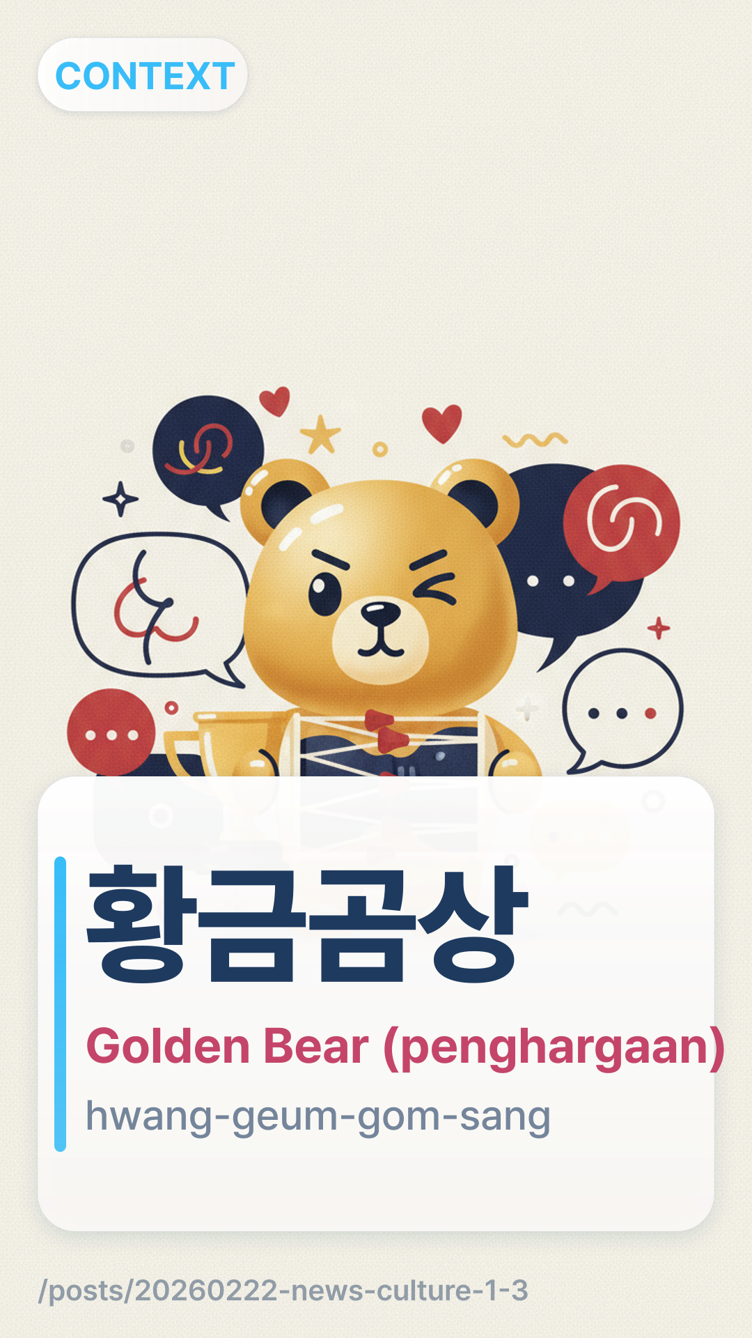 ํฉ๊ธ๊ณฐ์hwanggeumgomsang (Hwang-geum-gom-sang) merujuk pada "Golden Bear," penghargaan tertinggi di Festival Film Internasional Berlin. Beruang adalah hewan simbolis Berlin yang muncul di lambang kotanya, itulah sebabnya trofi tersebut berbentuk beruang.