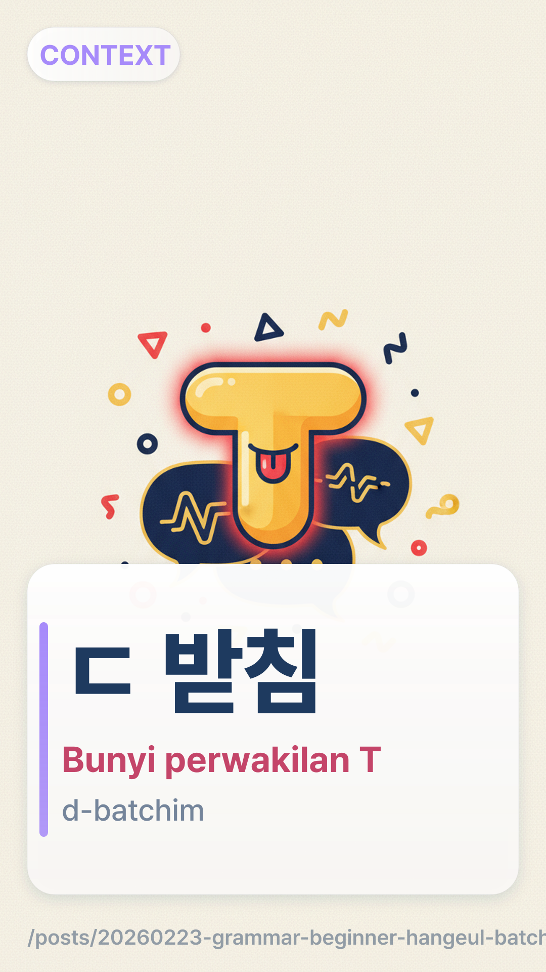 Banyak pemula melihat kata 꽃kkot dan mencoba melafalkan bunyi ㅊ di akhir, atau melihat 있다itda dan bertanya-tanya mengapa bunyinya tidak seperti 'is-ta'. Dalam bahasa Korea, meskipun ada banyak konsonan akhir, semuanya melebur menjadi hanya 7 bunyi perwakilan saat diucapkan.