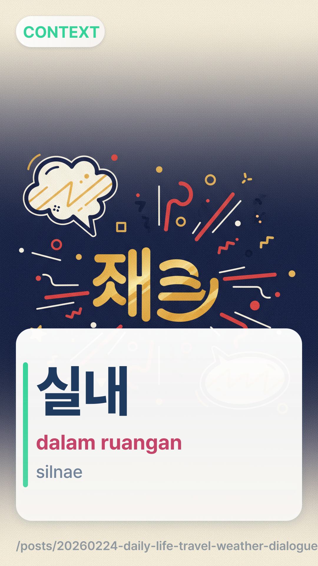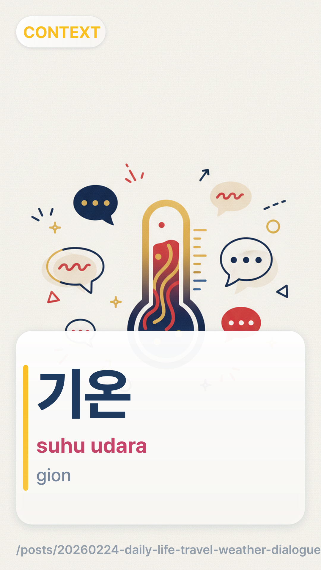 ์ค๋ดsilnae).์ผ๊ธฐ์๋ณดilgiyebo untuk mengetahui apakah akan turun salju.๊ธฐ์จgion merujuk pada suhu udara yang rendah, sehingga membutuhkan pakaian tebal.Periksa aplikasi cuaca Anda dalam bahasa Korea! Cari kata ๊ฐ์ํ๋ฅ gangsuhwakryul (probabilitas presipitasi) dan ์ต๊ณ ๊ธฐ์จchoegogion (suhu tertinggi) untuk melatih kosakata perjalanan Anda secara langsung.