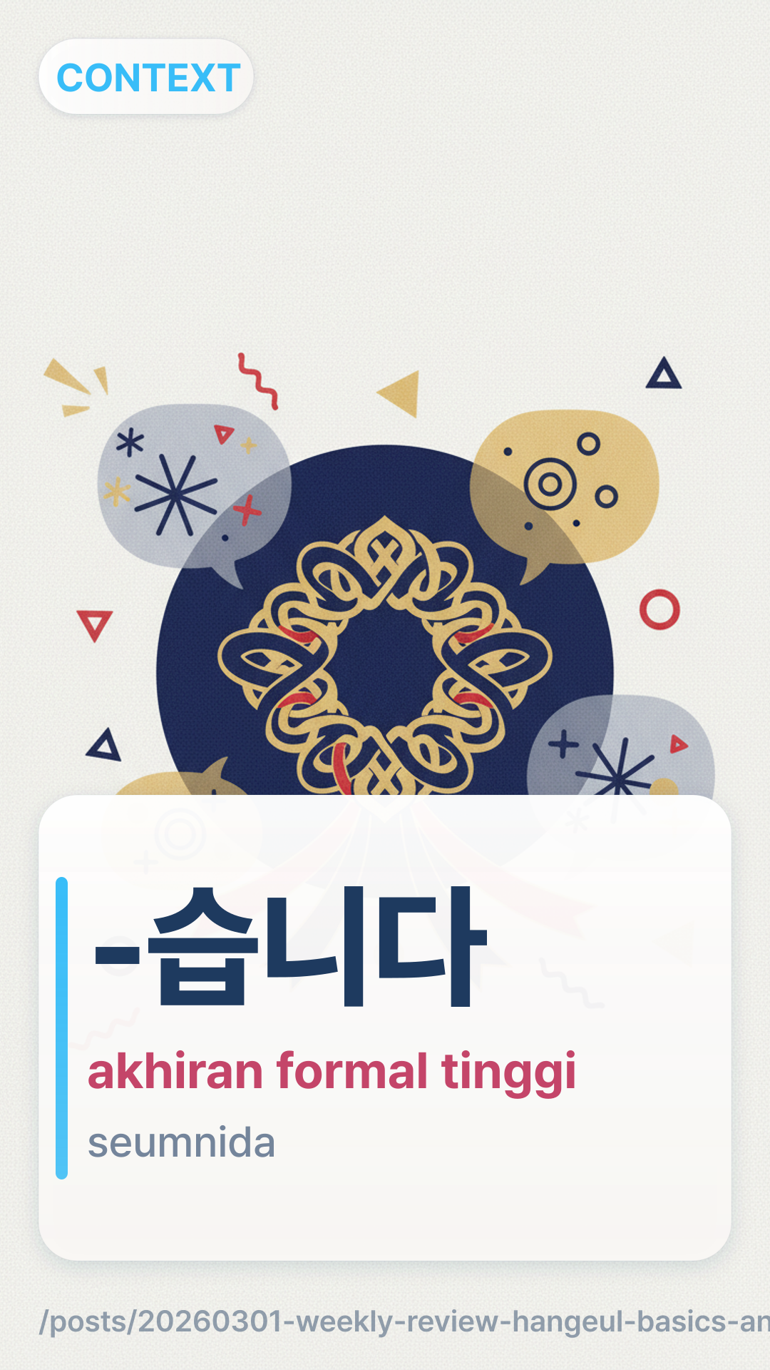 -์์/์ด์-ayo/eoyo dan akhiran formal tinggi -์ต๋๋ค-seupnida.๋ฐ๋งbanmal (kasual) versus ์กด๋๋งjondaetmal (sopan) berdasarkan hierarki sosial.์ด/๊ฐi/ga versus ์/๋eun/neun dalam struktur kalimat dasar.Daftar 10 ekspresi dengan arti satu baris: