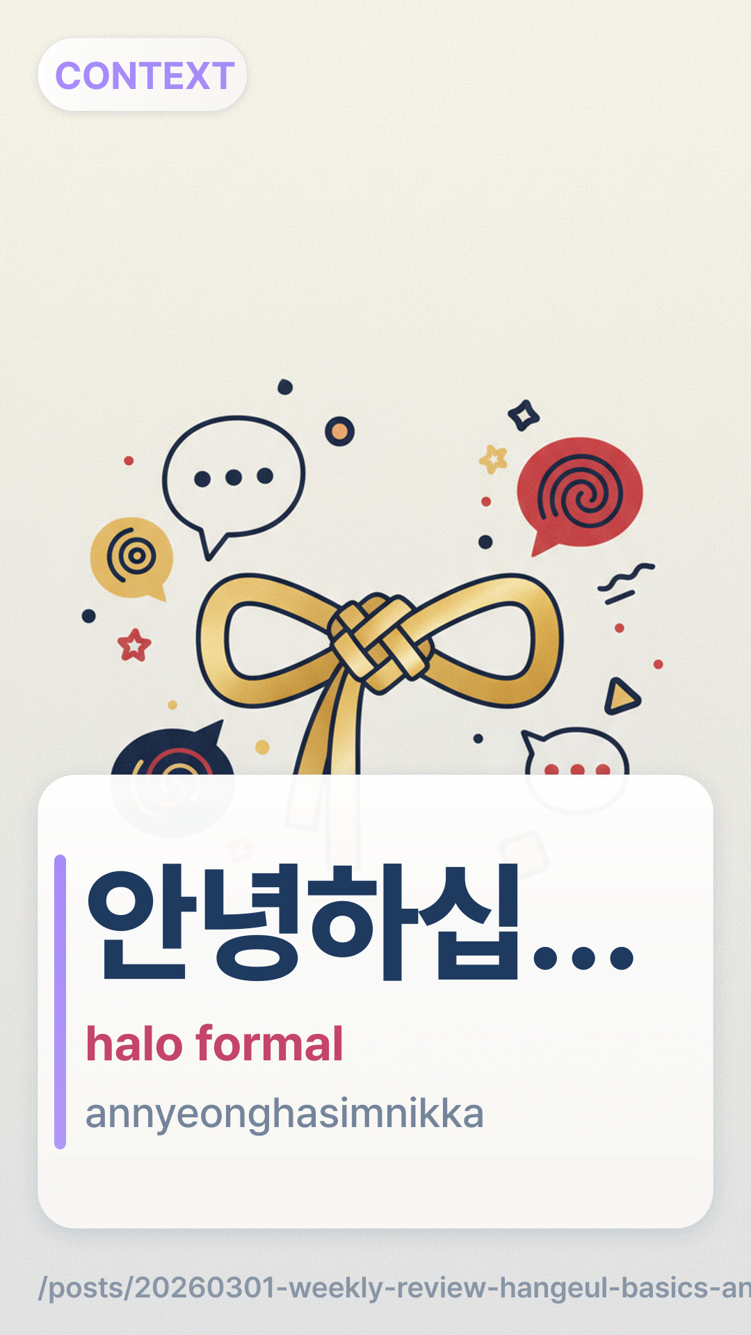 Tinjau 10 ungkapan penting bahasa Korea seperti ์๊ณ ํ์ จ์ต๋๋ค dan ์๋ ํ์ธ์. Kuasai salam dasar dan budaya sopan dengan kuis mingguan kami!