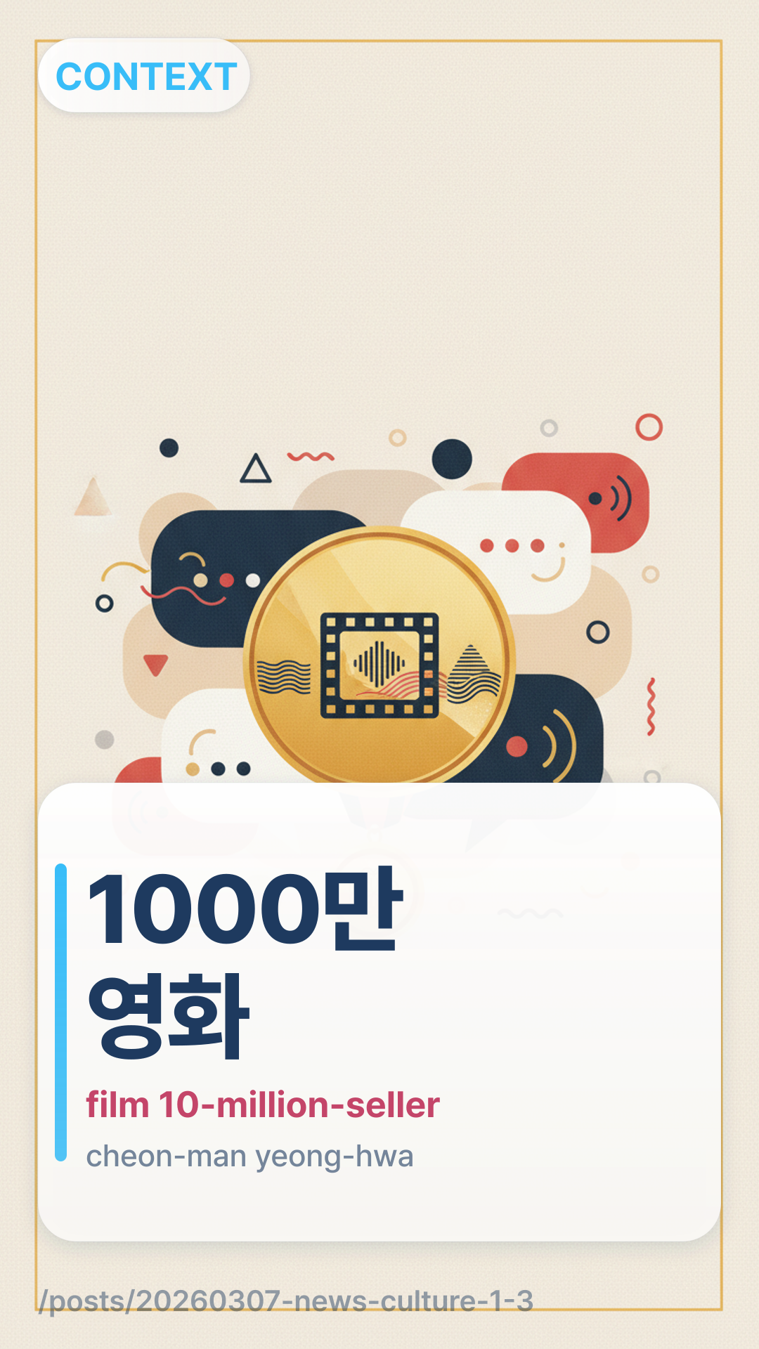 Dalam industri film Korea, 1000๋ง ์ํ1000man yeonghwa (Cheon-man yeong-hwa) mengacu pada film yang telah melampaui 10 juta tiket masuk bioskop. Karena total populasi Korea Selatan sekitar 51 juta, ini berarti hampir 20% dari populasi telah menonton film tersebut, menjadikannya hit nasional yang tersertifikasi.