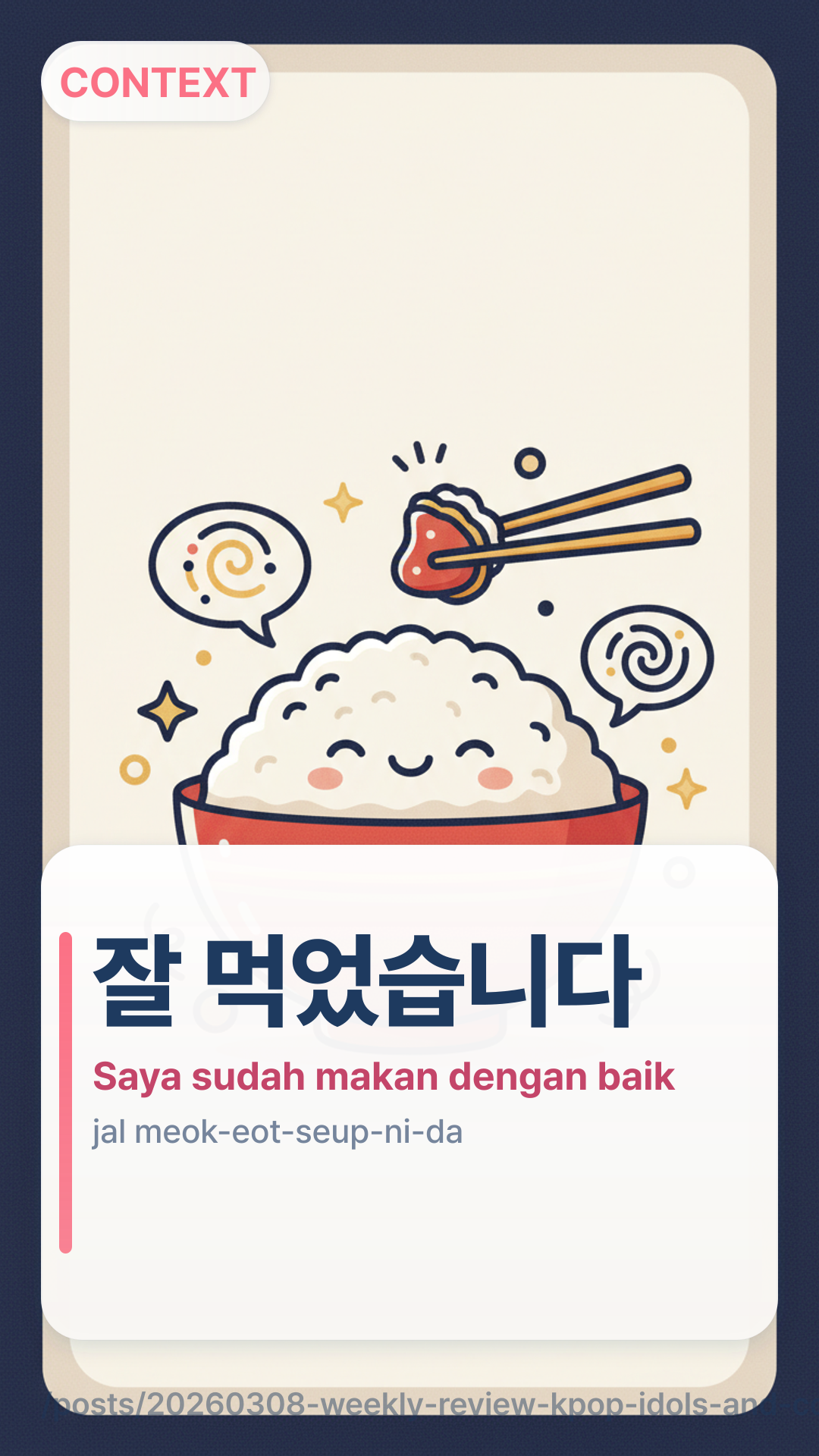 Setelah menghabiskan semangkuk Bibimbap yang lezat, Anda memberi tahu koki: "____."