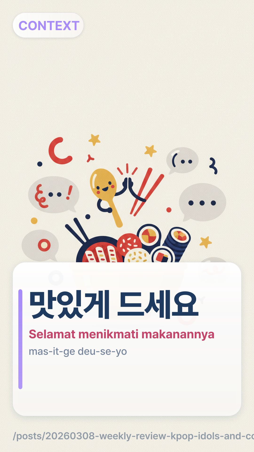 Ini adalah cara standar untuk memulai makan di Korea. Ini memberi sinyal kepada semua orang bahwa Anda siap untuk mulai dan menghargai makanannya. Bahkan jika Anda makan bersama teman, menggunakan bentuk sopan adalah hal umum untuk menunjukkan rasa hormat atas usaha yang dilakukan dalam menyiapkan makanan.