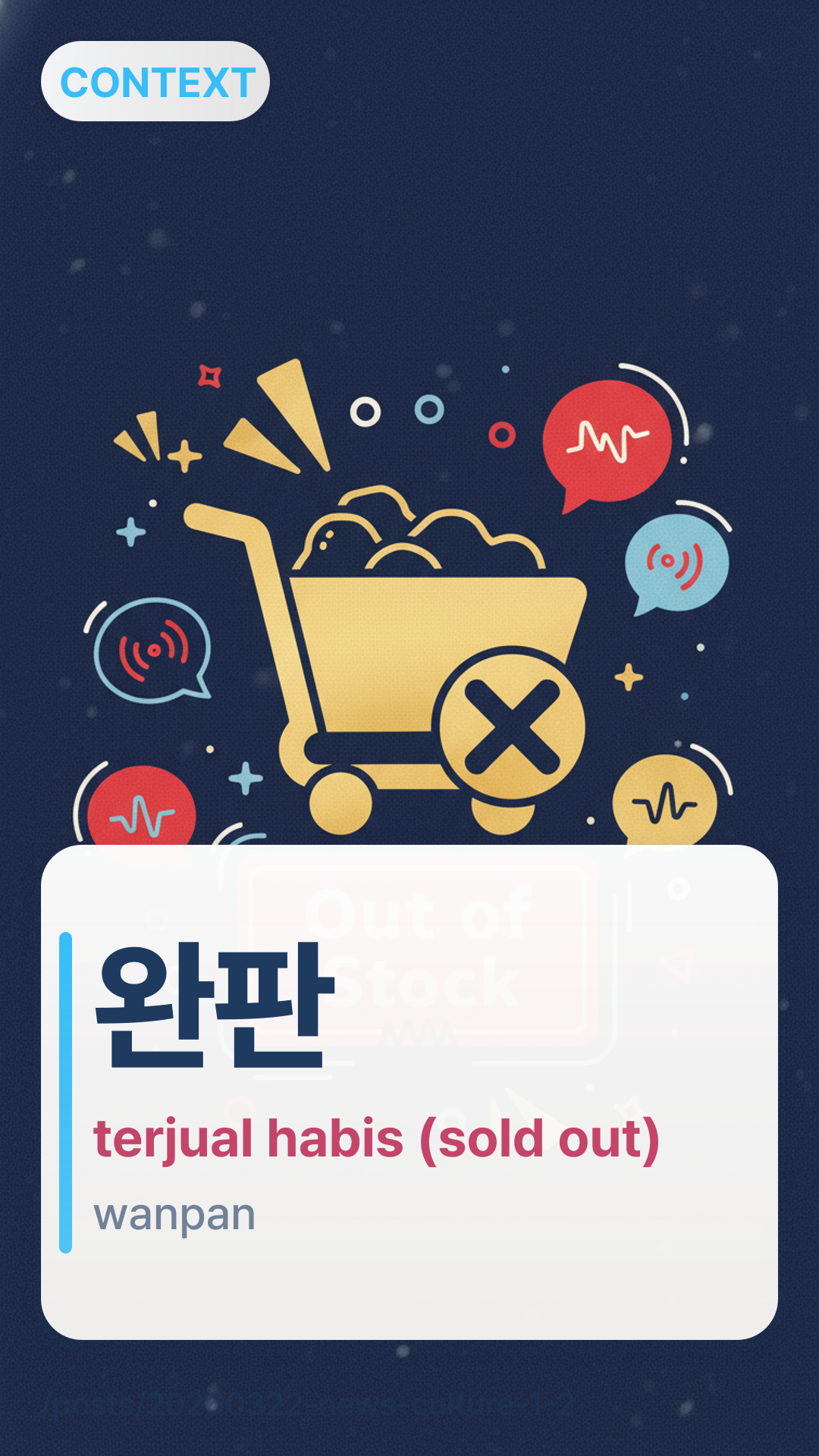 ์ํwanpan (wan-pan) adalah singkatan dari ์์ ํ๋งคwanjeon panmae (wan-jeon pan-mae), yang secara harfiah diterjemahkan sebagai "penjualan lengkap". Dalam budaya Korea modern, istilah ini digunakan untuk menggambarkan produk, tiket, atau item fesyen yang terjual habis seketika karena popularitas tinggi atau "efek selebriti".