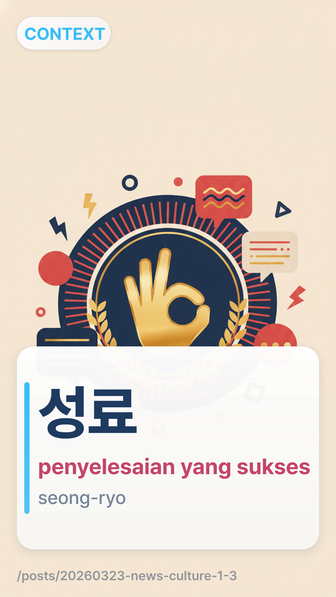 '์ฑ๋ฃ' (seong-ryo) adalah istilah formal berbasis Hanja yang sering digunakan dalam berita utama untuk menggambarkan penyelesaian yang sukses dari sebuah acara, seperti konser, festival, atau konferensi.
