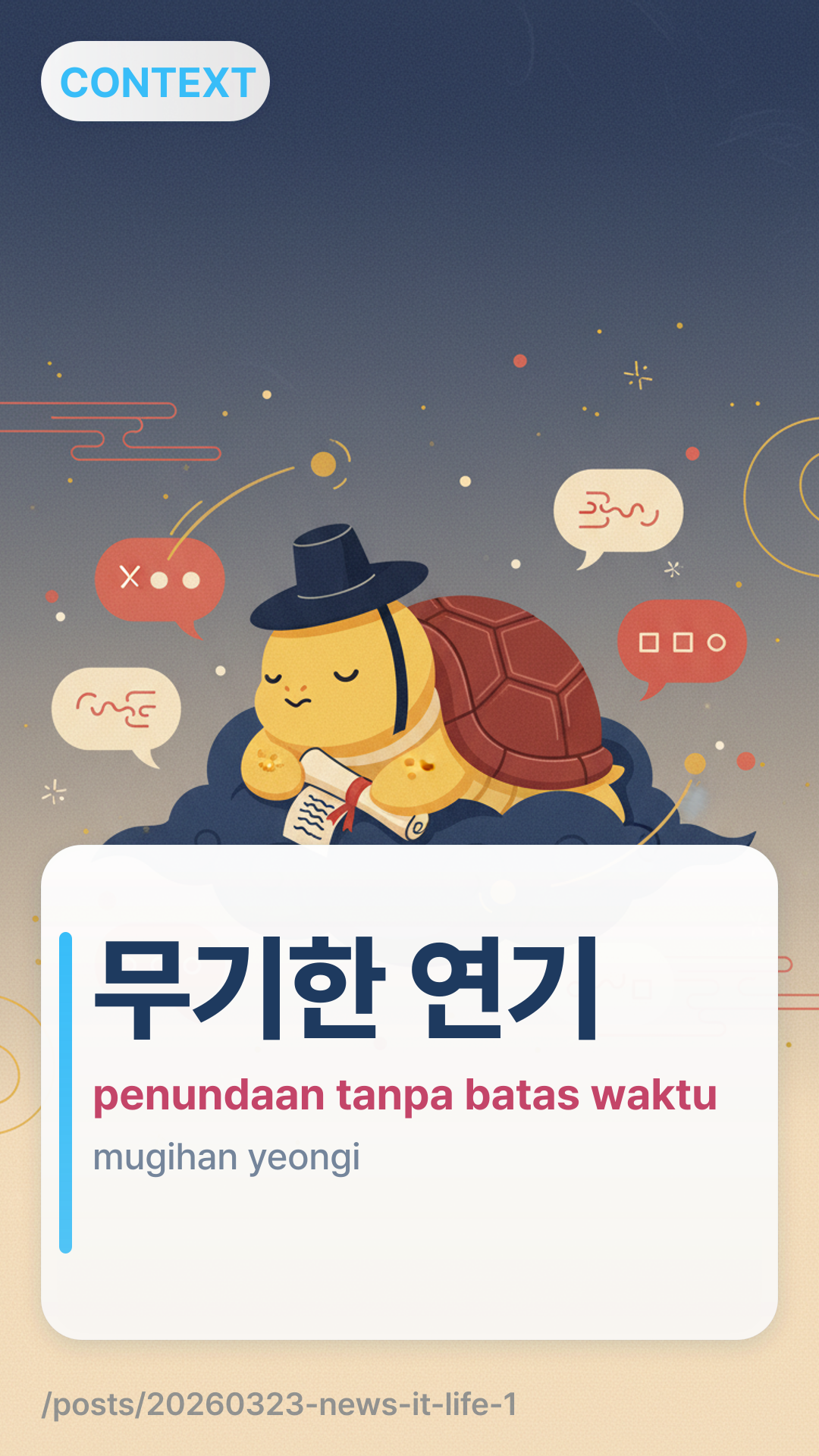 무기한 연기mugihan yeongi (mugihan yeongi) merujuk pada "penundaan tanpa batas waktu." Ini adalah gabungan dari 무기한mugihan (tidak ada batas waktu/periode yang ditentukan) dan 연기yeongi (penundaan). Dalam berita Korea, frasa ini sering digunakan ketika acara, proyek, atau rencana pribadi ditunda tanpa tanggal mulai yang spesifik karena kondisi yang tidak menguntungkan.