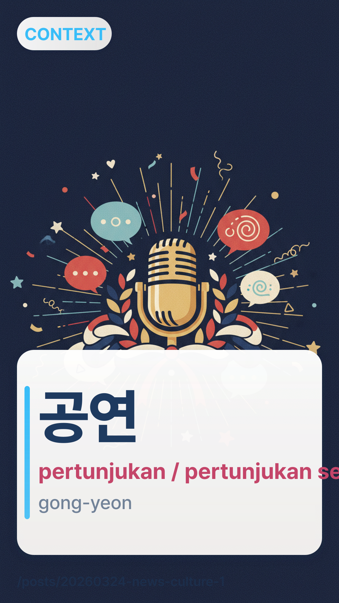 ๊ณต์ฐgoyeon (gong-yeon) merujuk pada pertunjukan publik, acara, atau konser. Ini adalah istilah luas yang digunakan untuk segala hal mulai dari musik orkestra dan drama hingga pertunjukan sulap dan resital tari. Dalam konteks berita, Anda akan sering melihatnya dipasangkan dengan ์์ yejeong (dijadwalkan) atau ์งํjinhaeng (sedang berlangsung).