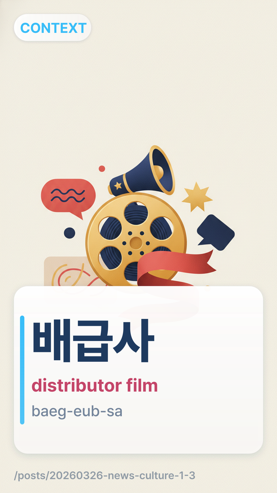 Dalam konteks industri hiburan Korea, ๋ฐฐ๊ธ์ฌbaegeupsa (baeg-eub-sa) adalah distributor film. Mereka adalah perantara antara perusahaan produksi dan bioskop, yang menangani pemasaran, penjadwalan, serta pengiriman fisik/digital film ke layar lebar.