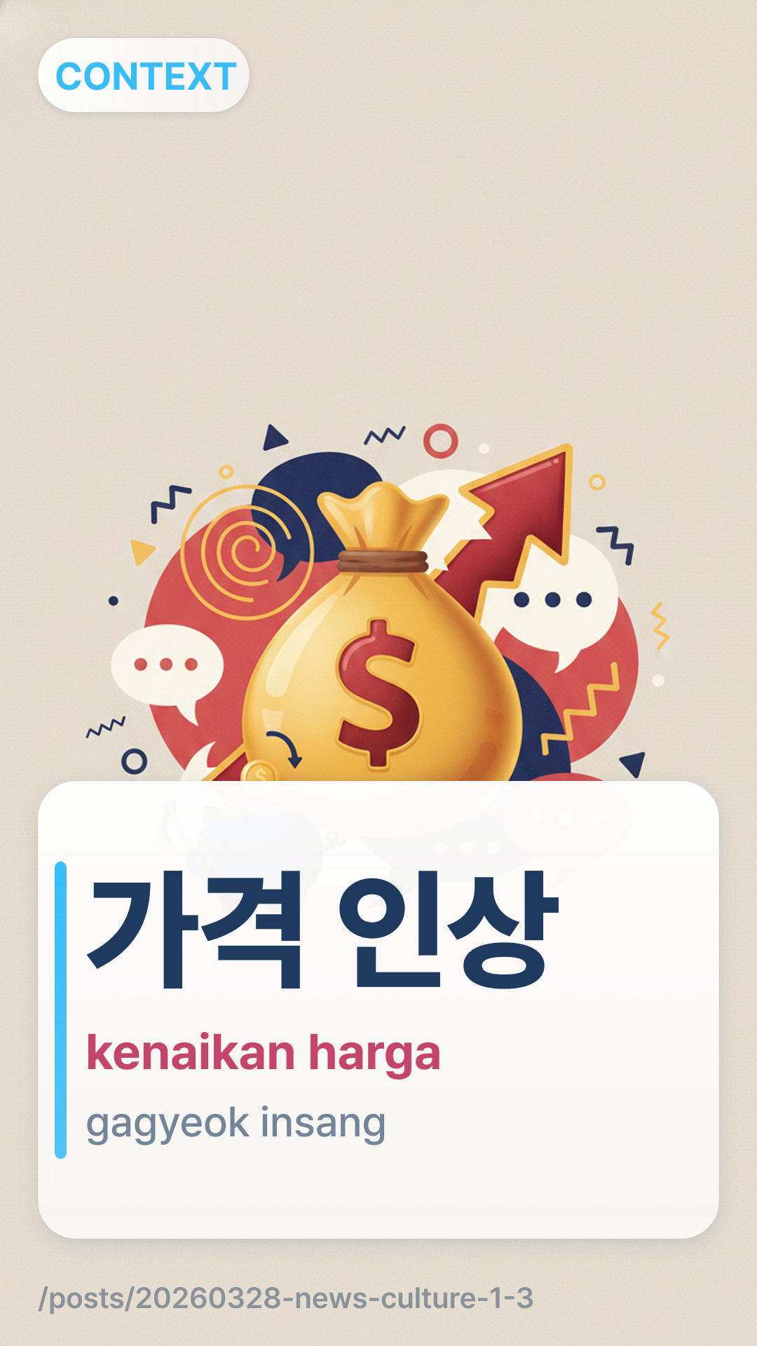 ๊ฐ๊ฒฉ ์ธ์gagyeok insang (gagyeok insang) merujuk pada "kenaikan harga" atau "lonjakan harga." Ini adalah istilah formal yang sering digunakan dalam berita utama mengenai ekonomi, ritel, dan industri layanan. ๊ฐ๊ฒฉgagyeok berarti harga, dan ์ธ์insang berarti kenaikan atau pengangkatan.