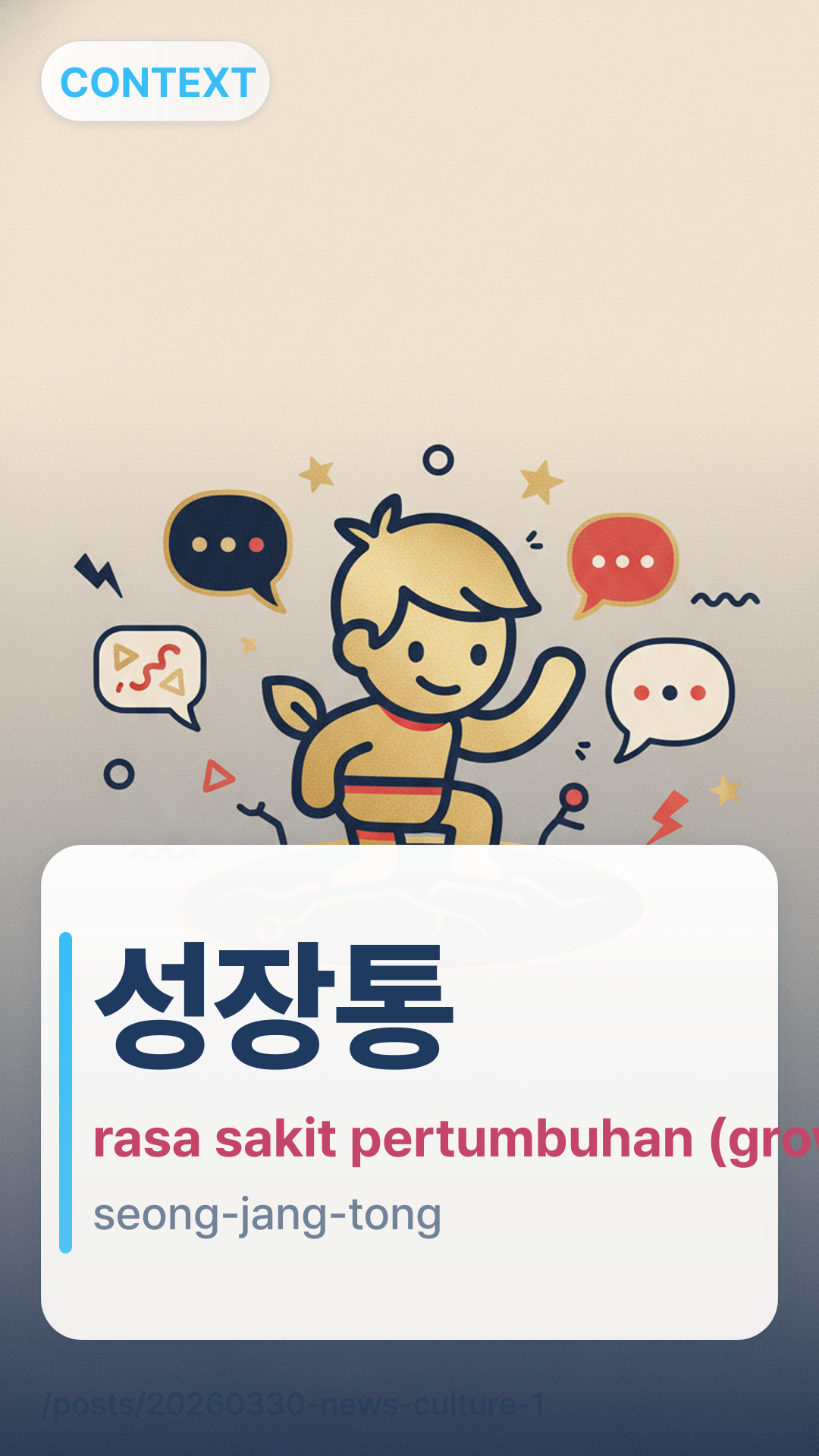 Dalam konteks artikel ini, ์ฑ์ฅํตseongjangtong (seong-jang-tong) merujuk pada perjuangan emosional dan psikologis yang terkait dengan pertumbuhan pribadi atau profesional. Meskipun secara harfiah berarti 'nyeri pertumbuhan' (rasa sakit fisik yang dirasakan anak-anak), istilah ini digunakan di sini untuk menggambarkan transisi sulit yang dilakukan BTS dari idol menjadi artis dewasa.