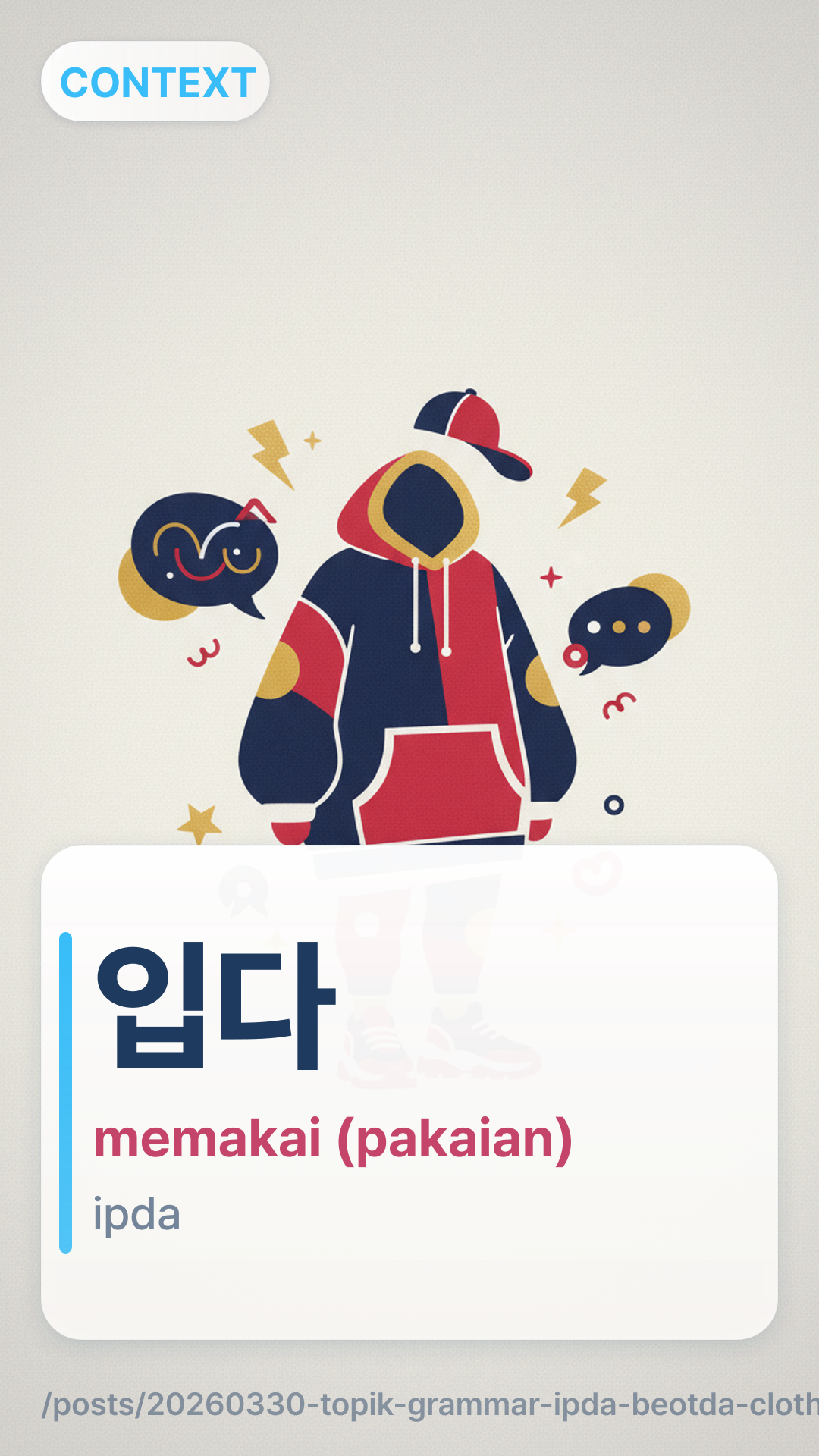 입다ipda secara khusus digunakan untuk 'mengenakan' atau 'memakai' barang-barang yang menutupi batang tubuh atau kaki Anda. Ini termasuk kaos, sweter, rok, celana panjang, dan gaun. Ini TIDAK digunakan untuk benda yang Anda kenakan di kepala, tangan, atau kaki.