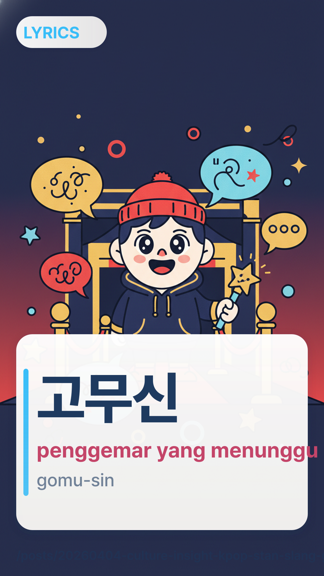 ๊ณ ๋ฌด์ gomusin untuk mengidentifikasi diri Anda sebagai penggemar setia selama masa hiatus.๊ฝ์ kkotsin (sepatu bunga) saat idol tersebut akhirnya selesai bertugas (discharged).๊ณ ๋ฌด์ gomusin (Sepatu Karet).๊ฝ์ kkotsin (Sepatu Bunga).๋ ์ด์ ๊ณ ๋ฌด์ ์ด์ผ.na ije gomusiniya. โ Aku jadi "sepatu karet" (penggemar yang menunggu) sekarang.๋๋์ด ๊ฝ์ ์ ๊ฒ ๋์ด์!deudieo kkotsin singe dwaesseoyo! โ Akhirnya aku bisa memakai "sepatu bunga" (dia sudah kembali!).๋๊น์ง ๊ณ ๋ฌด์ ๊ฑฐ๊พธ๋ก ์ ์ ์๊ฒ. โ Aku tidak akan memakai sepatu karetku terbalik (aku akan tetap setia) sampai akhir.๊ตฐ๋ฐฑ๊ธฐ ๋์ ๊ณ ๋ฌด์ ์ ์ ๊ณ ์์๊ฒ.gunbaekgi doan gomusin jal singo isseulge. โ Aku akan memakai sepatu karetku dengan baik selama masa hiatus militer.์ฐ๋ฆฌ ๋๋์ด ๊ฝ์ ์ ๋๋ค!uri deudieo kkotsin sinneunda! โ Kita akhirnya memakai sepatu bunga (merayakan selesai wamil)!Cobalah menggunakan kata kerja ์ ๋คsinda (memakai) dengan istilah-istilah ini. Kolokasi umum meliputi ๊ณ ๋ฌด์ ์ ์ ๋คgomusineul sinda (mulai menunggu), ๊ฝ์ ์ ์ ๋คkkotsineul sinda (selesai menunggu), dan ๊ณ ๋ฌด์ ์ ๊ฑฐ๊พธ๋ก ์ ๋คgomusineul geokkuro sinda (berkhianat/pergi). Periksa hitung mundur bebas tugas idol favorit Anda dan kirimkan emoji ๊ณ ๋ฌด์ gomusin untuk menunjukkan dukungan Anda hari ini!