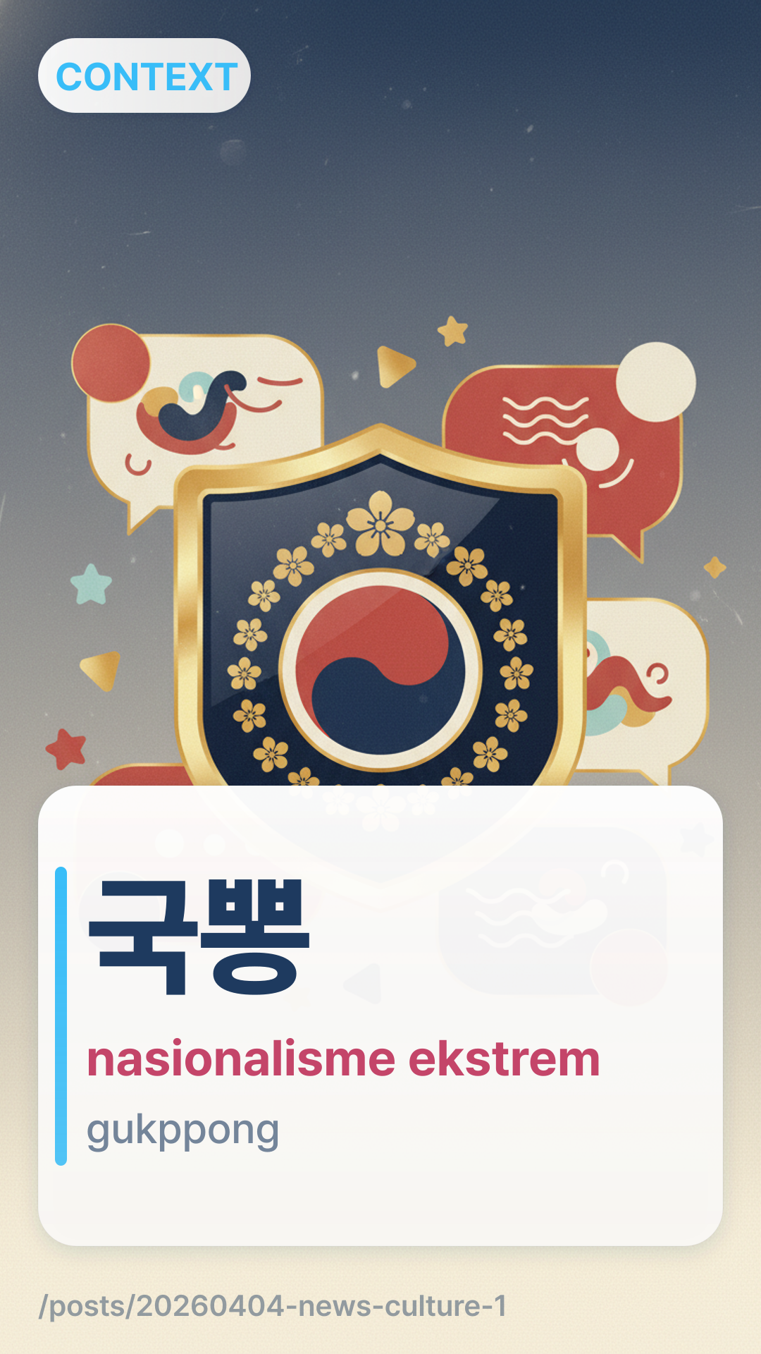 | ๊ตญ๋ฝ (Gukppong) | Nasionalisme Ekstrem/Paksa | Biasanya negatif; menyiratkan kurangnya objektivitas atau faktor "cringe". |
