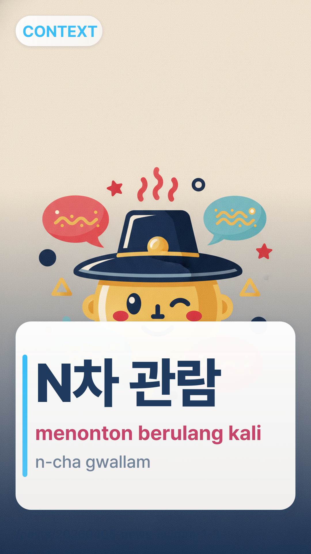 ์์ฆ ๊ทธ ์ํ๊ฐ ๋๋ฌด ์ข์์ N์ฐจ ๊ด๋ ์ค์ด์์.yojeum geu yeonghwaga neomu johaseo Ncha gwanram juieyo. โ Akhir-akhir ini aku sangat suka film itu sampai-sampai aku sedang dalam sesi menonton berulang.