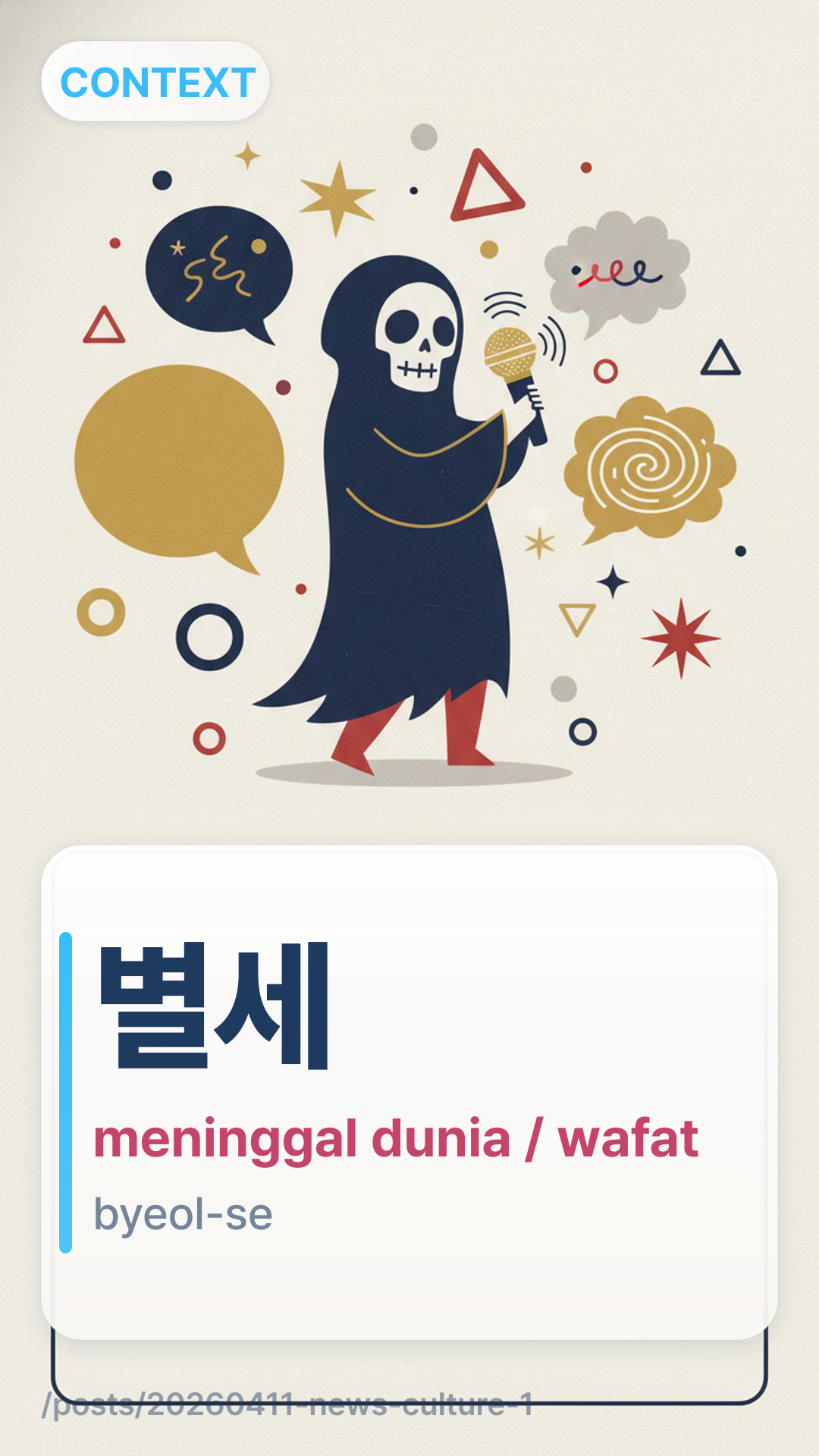 별세byeolse (byeol-se) adalah cara formal dan hormat untuk mengatakan "meninggal dunia" atau "wafat," biasanya digunakan untuk orang lanjut usia atau individu yang sangat dihormati. Secara harfiah diterjemahkan sebagai "meninggalkan dunia."