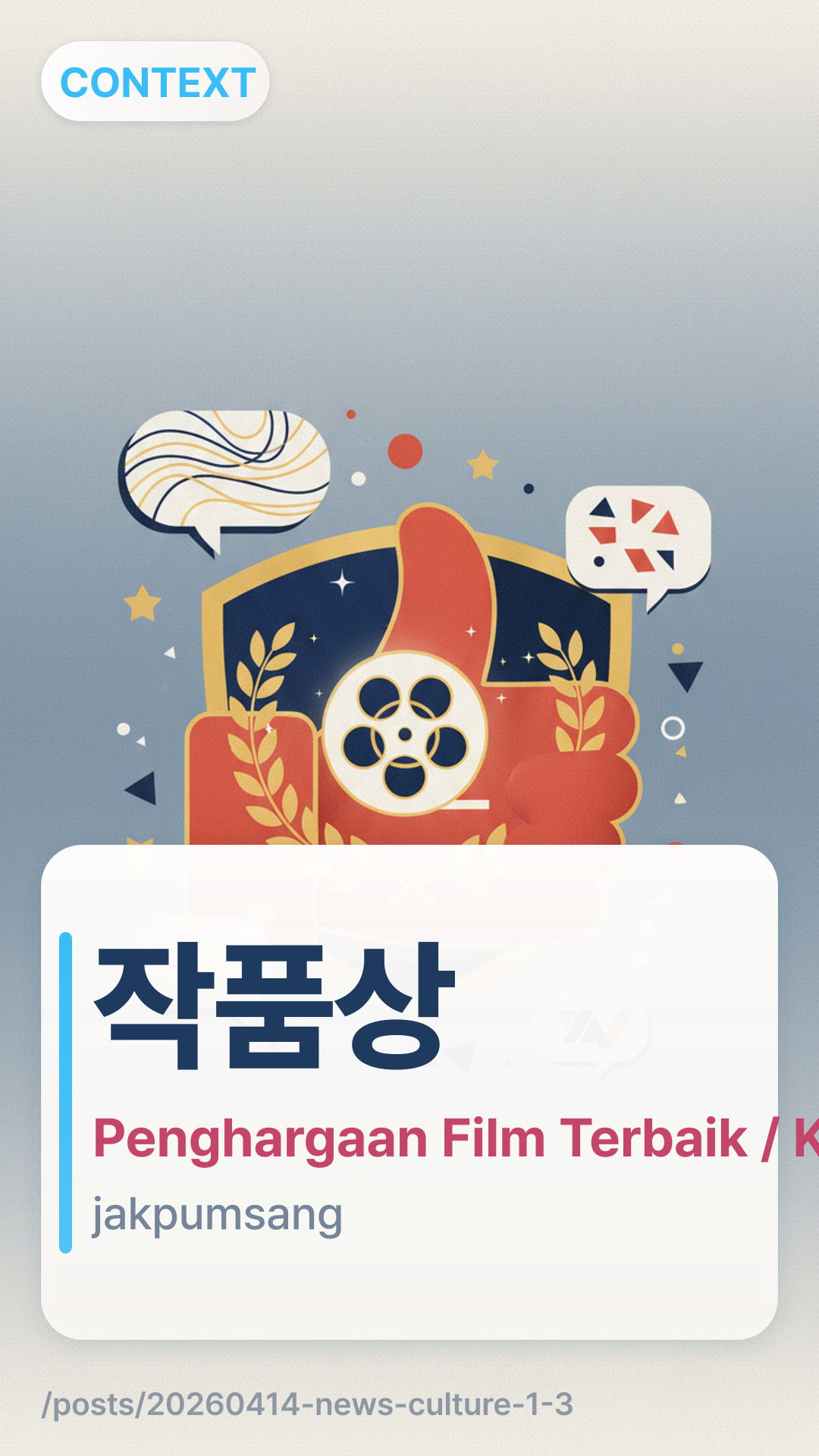 EN brief: ‘왕사남’-‘어쩔수가없다’, 백상예술대상 영화 작품상 후보…뮤지컬 부문 신설 (culture) + 1 glossary term.