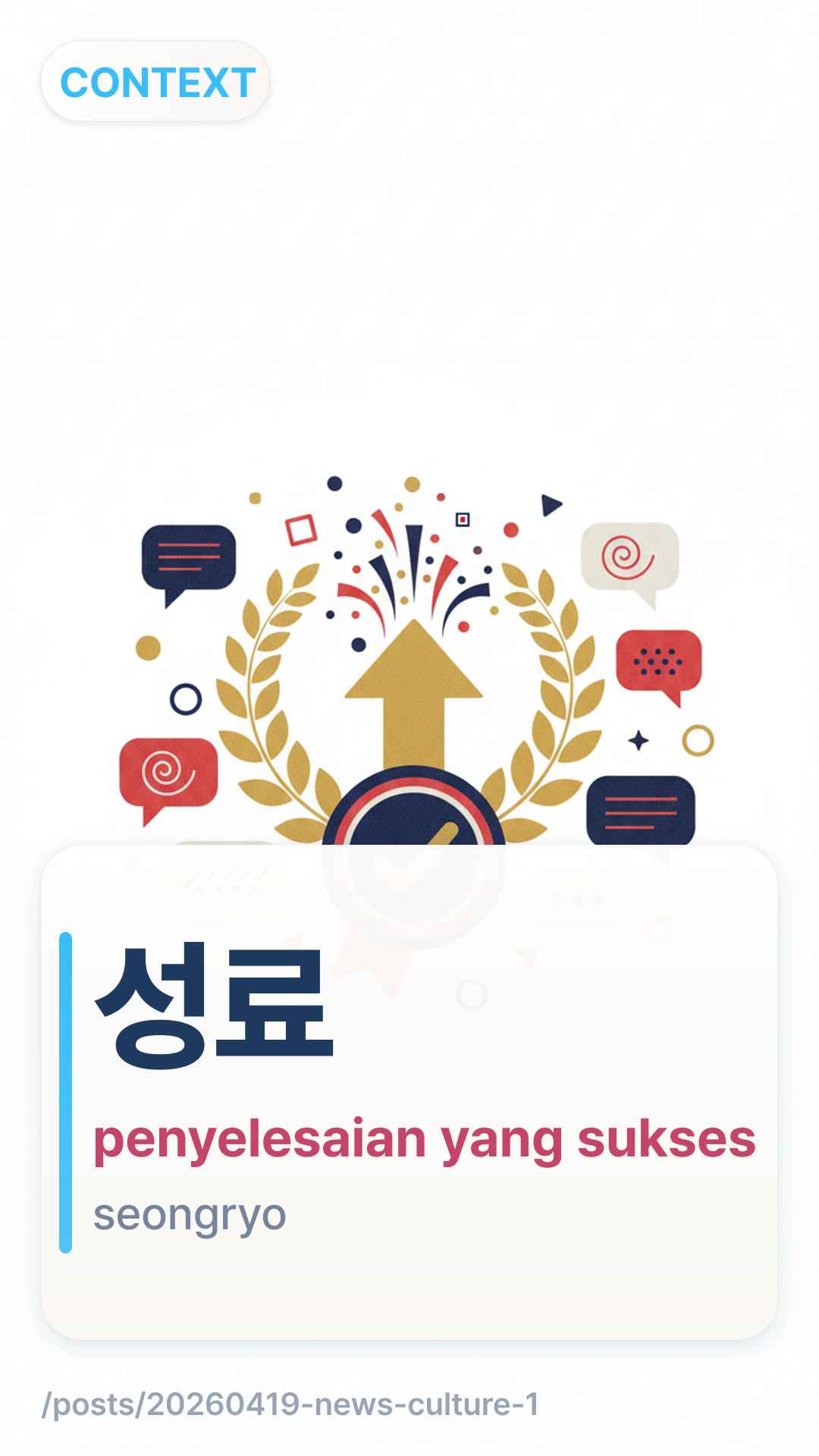 Dalam berita utama, Anda akan sering melihat kata ์ฑ๋ฃseongryo (seong-ryo). Kata ini menggabungkan karakter Hanja untuk "sukses" (ๆ) dan "selesai" (ไบ). Kata ini digunakan secara eksklusif dalam konteks formal seperti laporan berita atau pengumuman resmi untuk menunjukkan bahwa suatu acara, festival, atau proyek telah diselesaikan dengan sukses.
