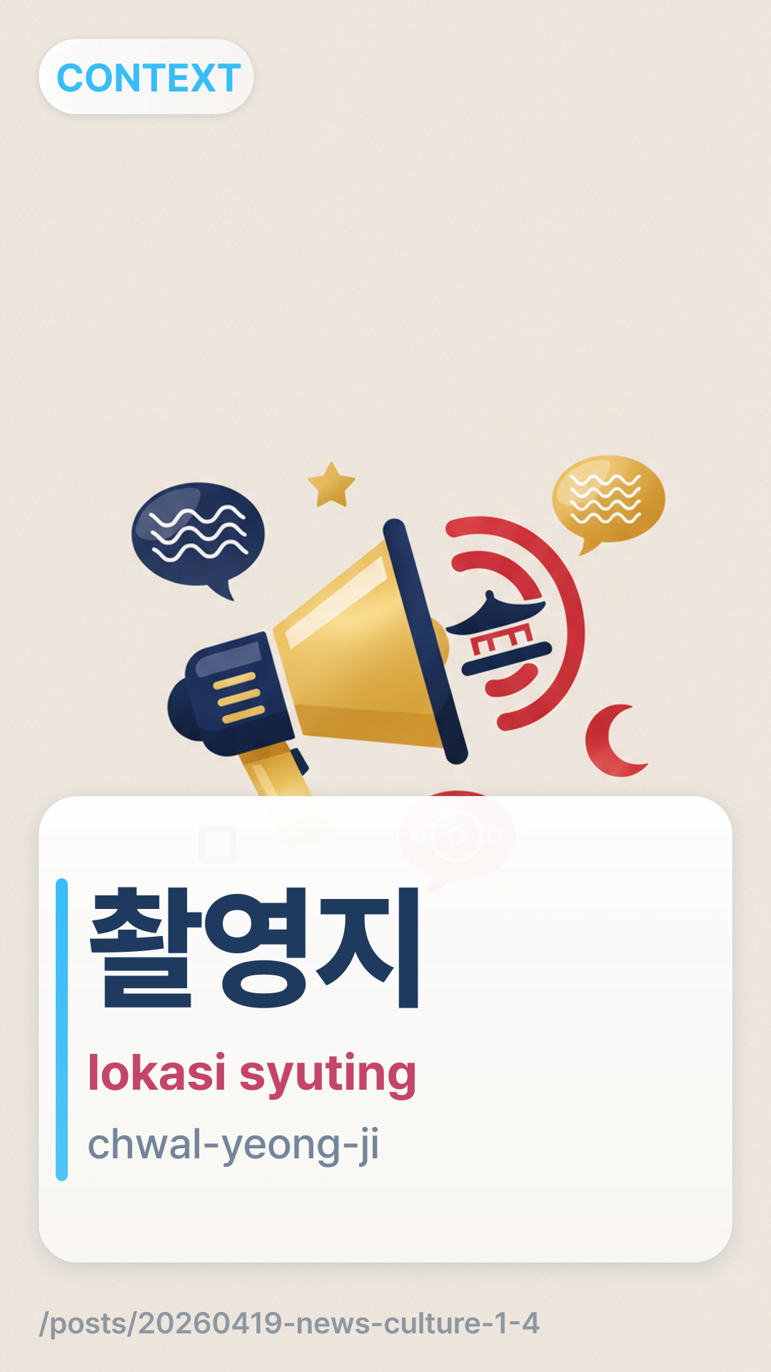 ์ดฌ์์งchwaryeongji (Chwal-yeong-ji) merujuk pada "lokasi syuting" atau "tempat pengambilan gambar." Ini adalah kata majemuk yang menggabungkan ์ดฌ์chwaryeong (syuting/pengambilan gambar) dan ์งji (situs/tanah). Dalam konteks Hallyu, lokasi-lokasi ini sering menjadi objek wisata utama setelah sebuah drama atau film menjadi populer.