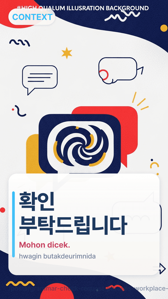 Sebuah “meter” tingkat menekan + slot konteks→permintaan→tenggat mengajarkan alternatif 확인 부탁드립니다 yang terdengar tegas tapi tidak memerintah, untuk berbagai tingkatan jabatan.