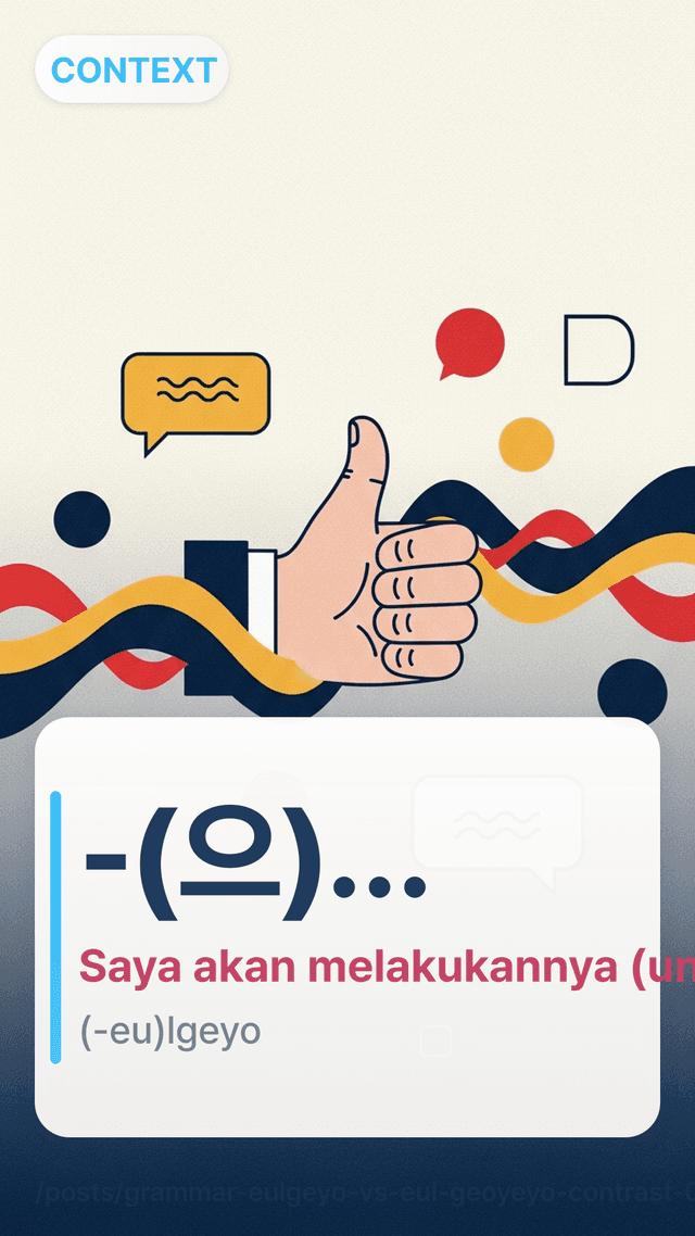 -(으)ㄹ 거예요-(eu)ㄹ geoyeyo berarti “(Aku) akan…” atau “Akan…” untuk rencana dan prediksi. Ini pilihan yang lebih aman ketika kamu tidak sedang berkomitmen langsung kepada lawan bicara.
