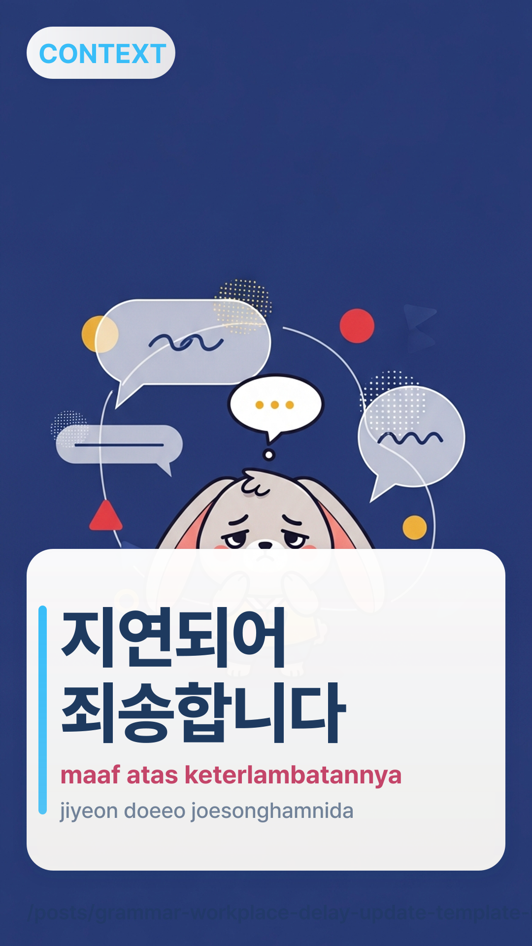 지연되어 죄송합니다. {현재 상태} 중이며 {다음 액션} 후 {시간}까지 공유드리겠습니다.jiyeondoeeo joesonghapnida. {hyeonjae sangtae} juimyeo {daeum aeksyeon} hu {sigan}kkaji goyudeurigetseupnida. — Maaf atas keterlambatannya. Saya sedang {status} dan akan membagikan sebelum {time} setelah {next action}.