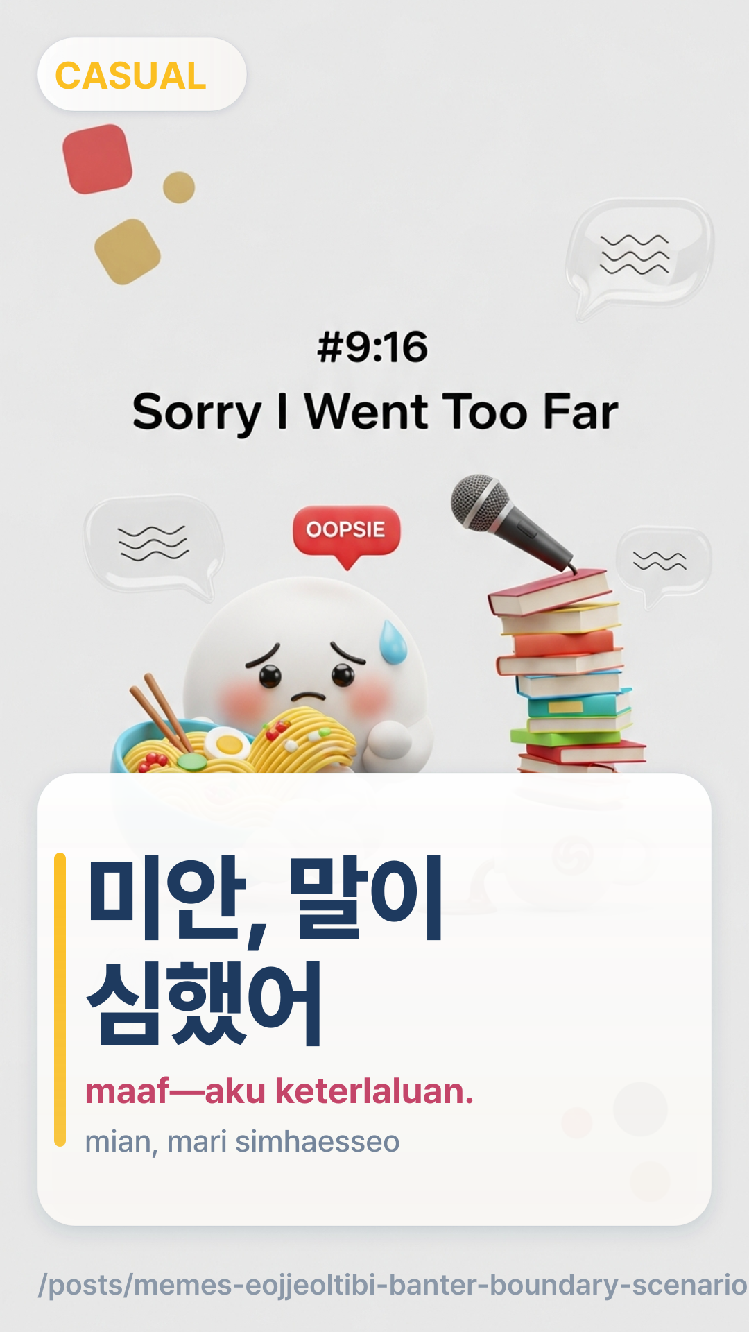 Kalimat perbaikan ini mengakui bahwa kamu kebablasan tanpa kebanyakan alasan. Paling efektif tepat setelah ada batas seperti 그만해geumanhae atau 선 넘네seon neomne. Jebakannya adalah langsung memberi alasan; mending singkat dulu.