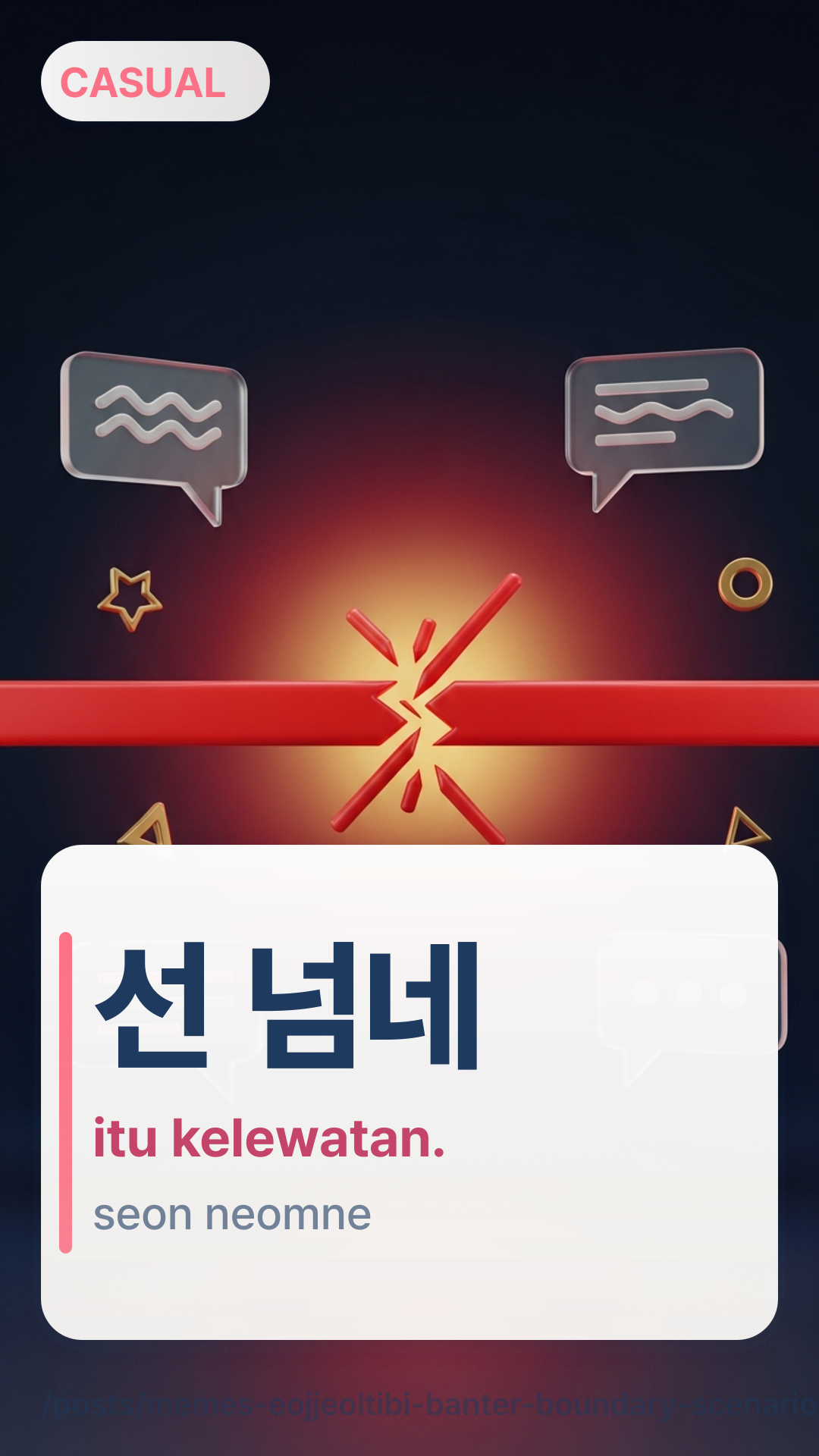 미안, 말이 심했어mian, mari simhaesseo mengakui kamu kebablasan dan memberi sinyal perbaikan; mengelak dengan meme어쩔티비eojjeoltibi/어쩔~eojjeol~ setelah ada batas biasanya malah eskalasi. - Q2: