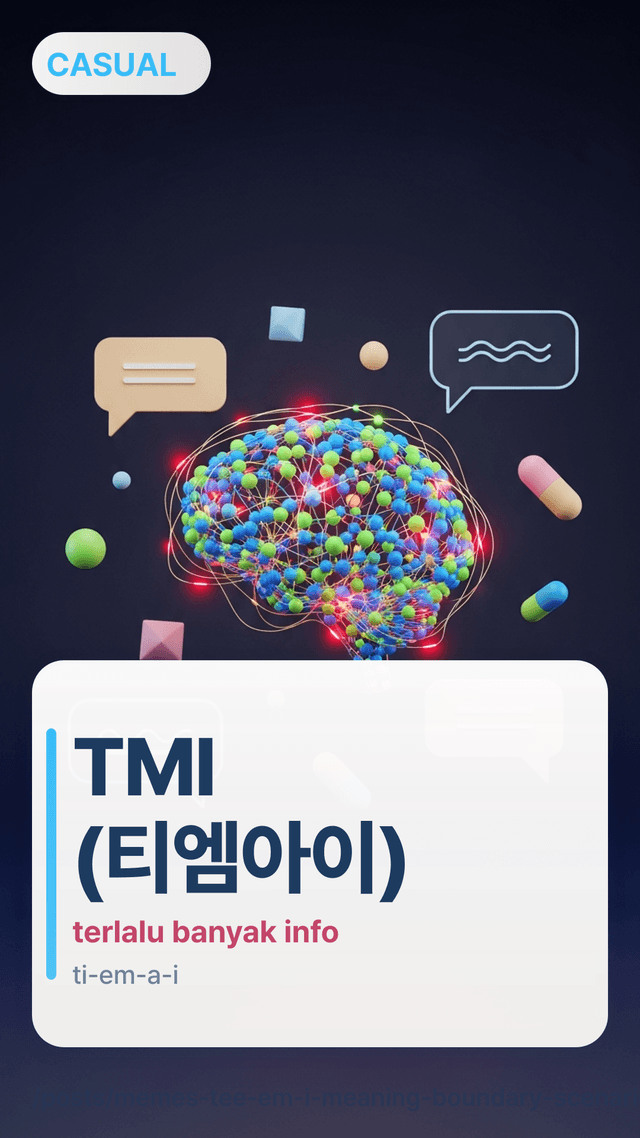 TMI adalah meme chat Korea yang dipinjam dari bahasa Inggris “Too Much Information.” Di Korea, ini sering dipakai dengan ringan, seperti “detail tambahan yang seru,” tapi juga bisa berarti “terlalu pribadi / tidak perlu.” Jebakan umum: pembelajar mengira ini selalu terdengar kasar. Sebenarnya tergantung nada dan hubungan.