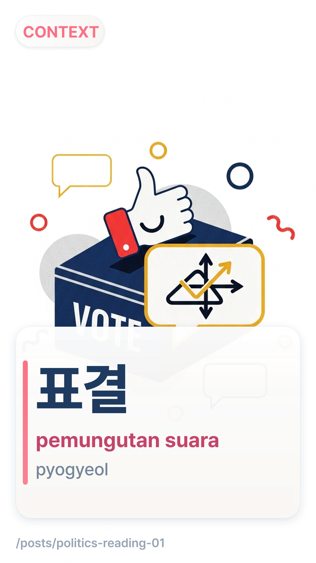표결pyogyeol adalah tindakan (atau konteks hasil) pemungutan suara, dan headline memakainya untuk membingkai titik keputusan. Jebakan lain: menganggap artinya “semua orang voting” secara dramatis; ini bisa merujuk pada voting rutin, dan hasilnya bisa tidak jelas kecuali kamu melihat kata seperti 가결gagyeol (lolos/disahkan) atau 부결bugyeol (ditolak).