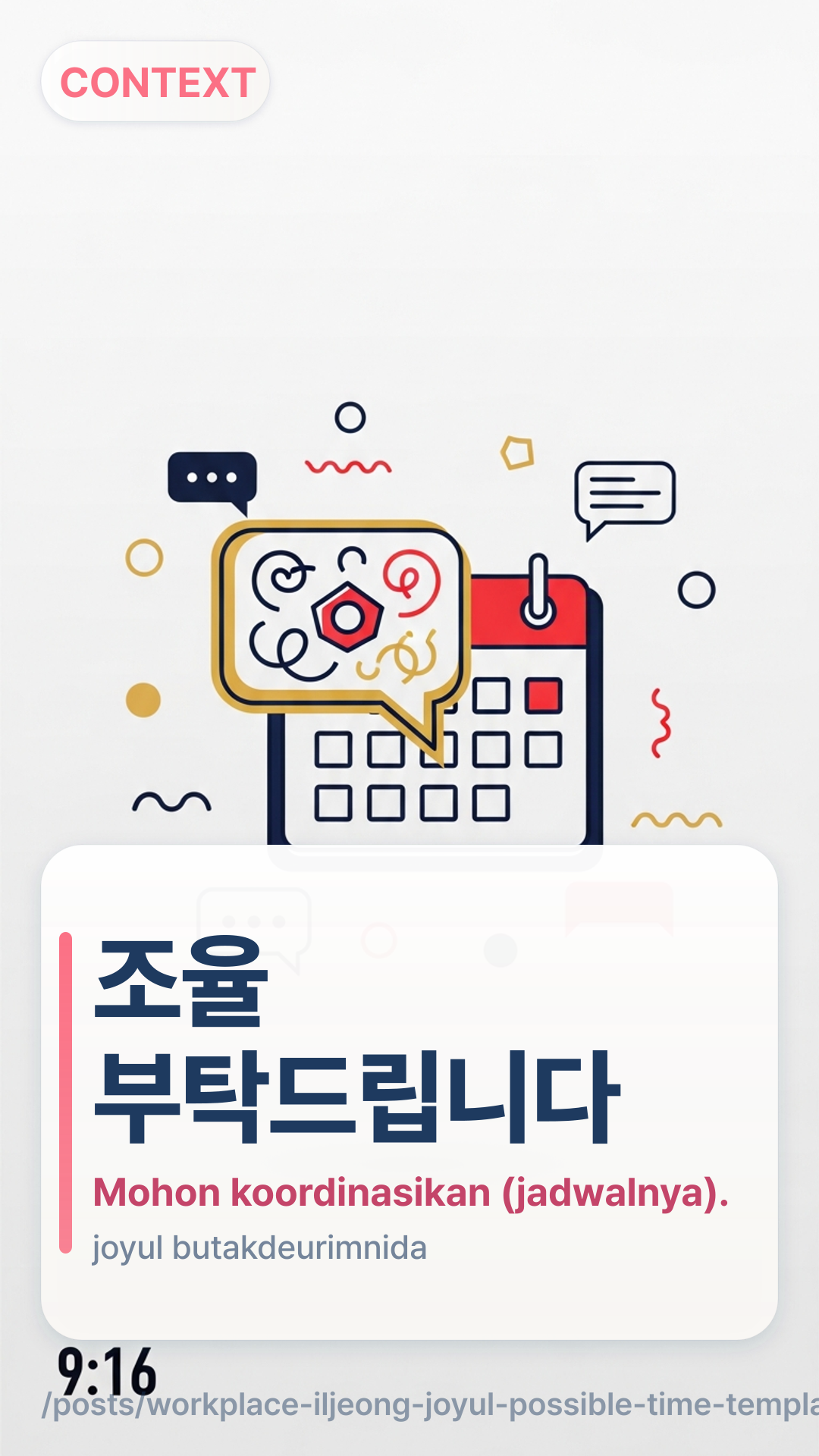 Gunakan 조율 부탁드립니다joyul butakdeuripnida saat penjadwalan melibatkan banyak orang, approval, atau kalender. Ini frasa kantor klasik untuk “mari selaraskan”.