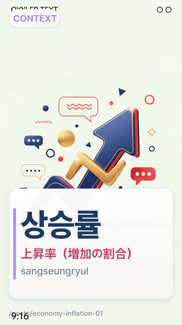 상승률sangseungryulは「上昇の割合」=%の変化で、絶対額として「いくら上がった」ではありません。会話では、英語学習者が比較の基準(前年同月比/前月比など)を言わずに「価格がX増えた」と訳してしまいがちですが、そこが重要です。