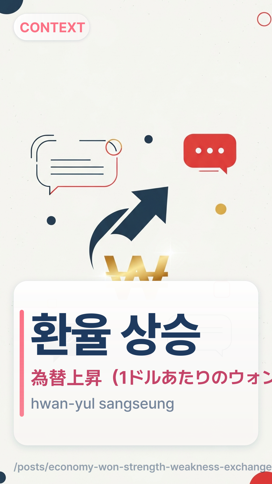 환율 상승/하락hwanyul sangseung/harakを見たら、必ずもう1句足す:「だから원화wonhwaは強い/弱い」。- 見出しに