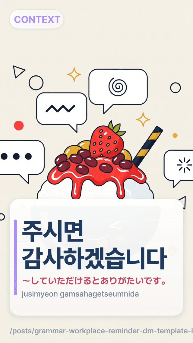 -시--si- を使い、職場DMは주실jusil /주시면jusimyeon を優先。 - 押しを和らげる:可能なら冒頭に