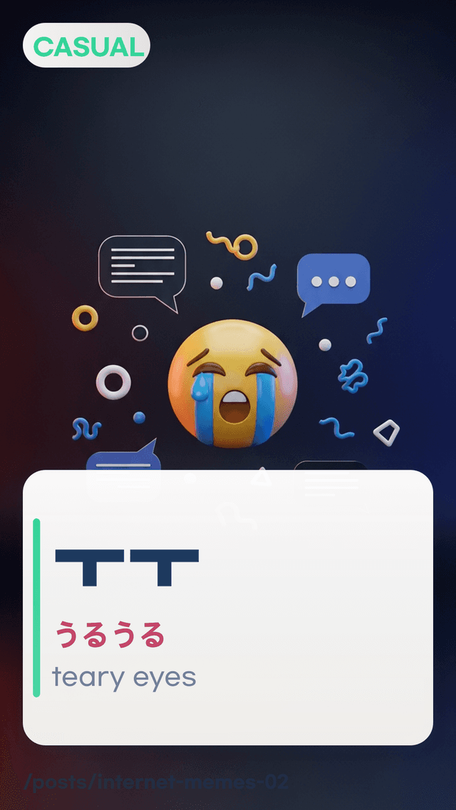 ㅠㅠㅠㅠ は「泣いてる目」。悲しい、申し訳ない、しんどい、あるいは「感動した」でも使えます。