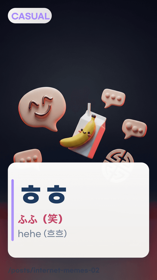 ㅎㅎㅎㅎ は息を漏らすようなやわらかい笑いで、hehe(へへ)みたいな感じ。メッセージを軽くしたり、お願いを柔らかくしたりするときに使います。