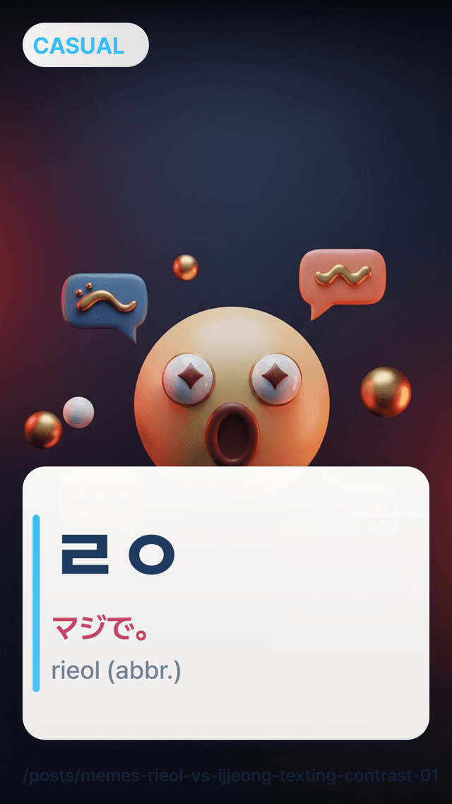 ㄹㅇ?rieol? — 「マジで?」(真偽/驚きチェック)ㄹㅇㅋㅋㄹㅇㅋㅋ — 「マジかw」(驚き + ふざけ)ㅇㅈㅇㅈㅇㅈㅇㅈ — 「それなそれな。」(同意強め)ㅇㅈ?injeong? — 「同意だよね?」(確認;文脈によっては少し押しつけがましい)