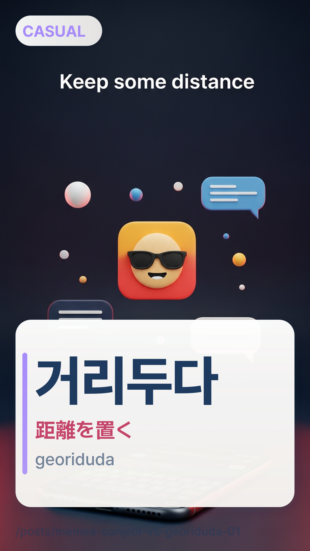 `거리두다`は「距離を作る」こと=接触を減らす/近さを減らす/アクセスを減らす、という意味で、完全な別れを宣言するわけではありません。同じ集団・職場・友人コミュニティなどで共存が必要だったり、あとで戻せる状態にしておきたかったりする場合に、より安全で社会的に受け入れられやすい選択です。落とし穴:学習者が「ブロックする」の意味で使うことがありますが、多くの場合「完全に連絡断ち」ではなく「一歩引く」と読まれます。