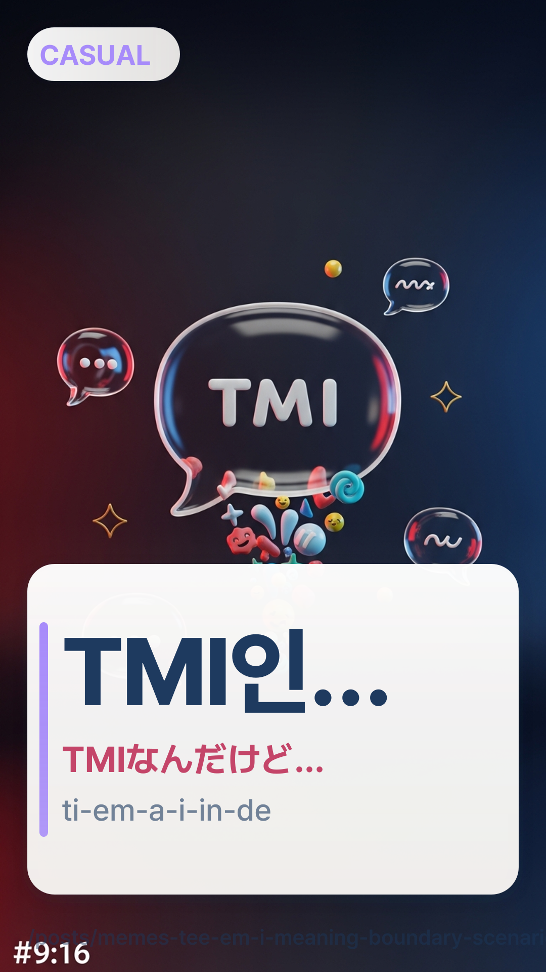 TMI인데…tiemaiinde…は自己申告の前置きで、「TMIかもだけど…」というニュアンス。相手を責めずに、自分の情報量をコントロールしている感じになるので便利です。注意点:こう言っておいて長く重い話(センシティブな話)を落とすと、結局相手を居心地悪くさせることがあります。