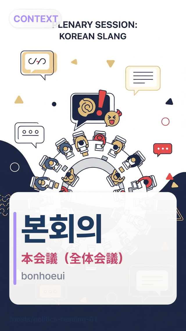 본회의bonhoeui は「場/段階」を指します。委員会レベルの作業と対比されることが多く、最終的な判断が行われやすい本会議のフロアに乗った、という手続き的ニュアンスです。決定が近いことを示唆し得ますが、投票が行われたことを保証するわけではありません。