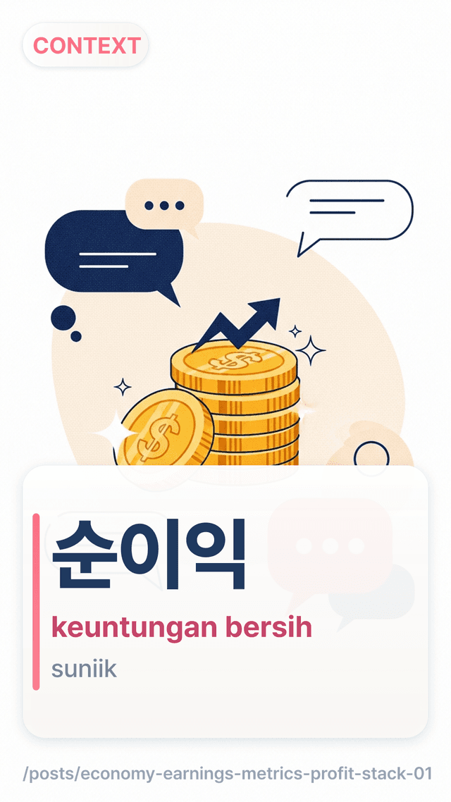 일회성 요인으로 순이익이 크게 늘었습니다.ilhoeseong yoineuro suniigi keuge neureotseupnida. — Keuntungan bersih meningkat banyak kerana faktor sekali sahaja.순이익 적자 전환suniik jeokja jeonhwan — Bertukar kepada kerugian bersih.영업이익이 좋아도 순이익은 다르게 나올 수 있습니다.yeoeobiigi johado suniigeun dareuge naol su itseupnida. — Walaupun keuntungan operasi kuat, keuntungan bersih boleh kelihatan berbeza.