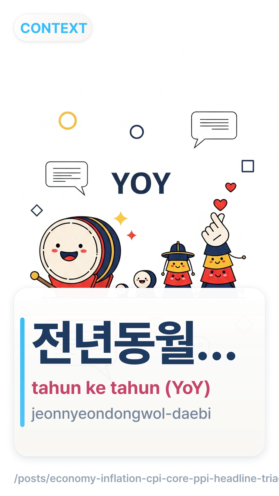 Huraikan `전년동월대비` dan `근원물가` dalam tajuk inflasi dengan pokok triage CPI/teras/PPI serta latihan penukaran % vs %p—supaya bacaan anda tepat.