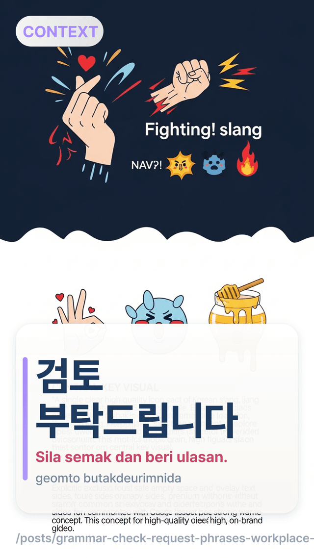 Meter “terlalu mendesak” + slot konteks→permintaan→tarikh akhir membantu anda pilih alternatif 확인 부탁드립니다 yang bunyinya tegas tetapi tidak bossy merentas hierarki.