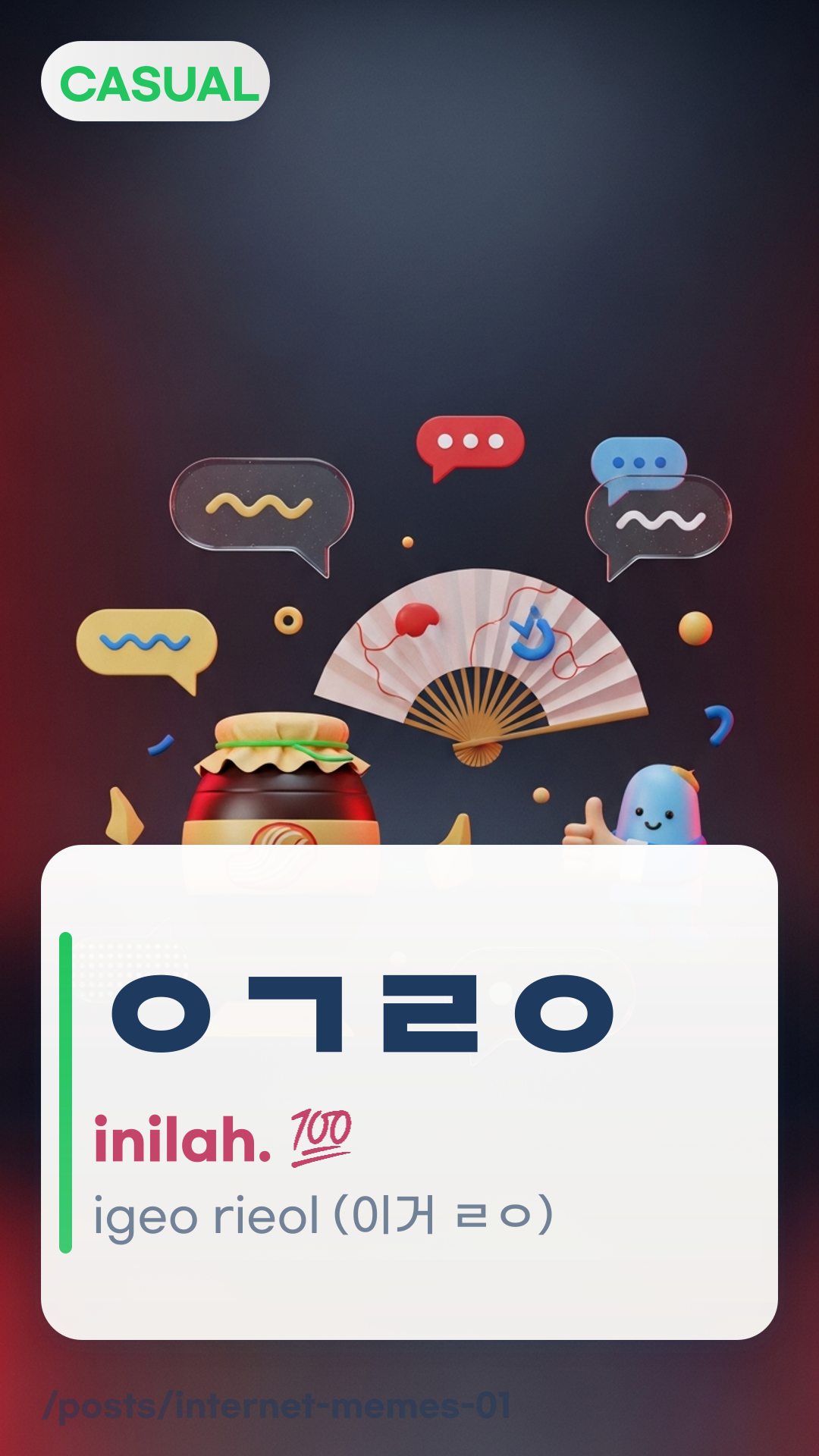 Panduan mesra pemula untuk 7 reaksi meme internet Korea dan singkatan sembang (ㅇㅈ, ㄹㅇ, TMI, 킹받네, 팩폭, ㅇㄱㄹㅇ, 정색) lengkap dengan nuansa, tip kesopanan, dialog sembang, dan kuiz mini.