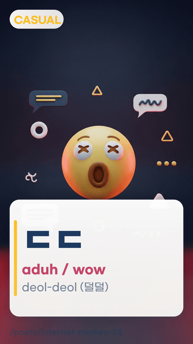 ㄷㄷㄷㄷ datang daripada 덜덜deoldeol (menggigil). Ia reaksi kepada terkejut, takut, atau “gila betul.” Bergantung pada konteks, ia boleh jadi “aduh” atau “wow.”