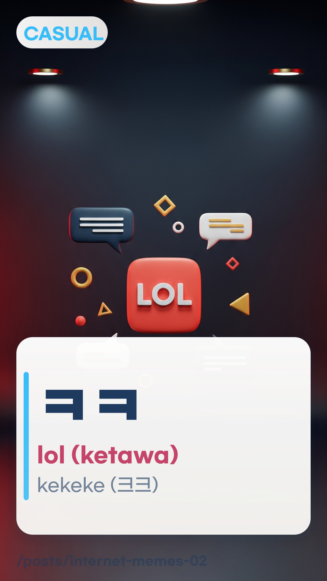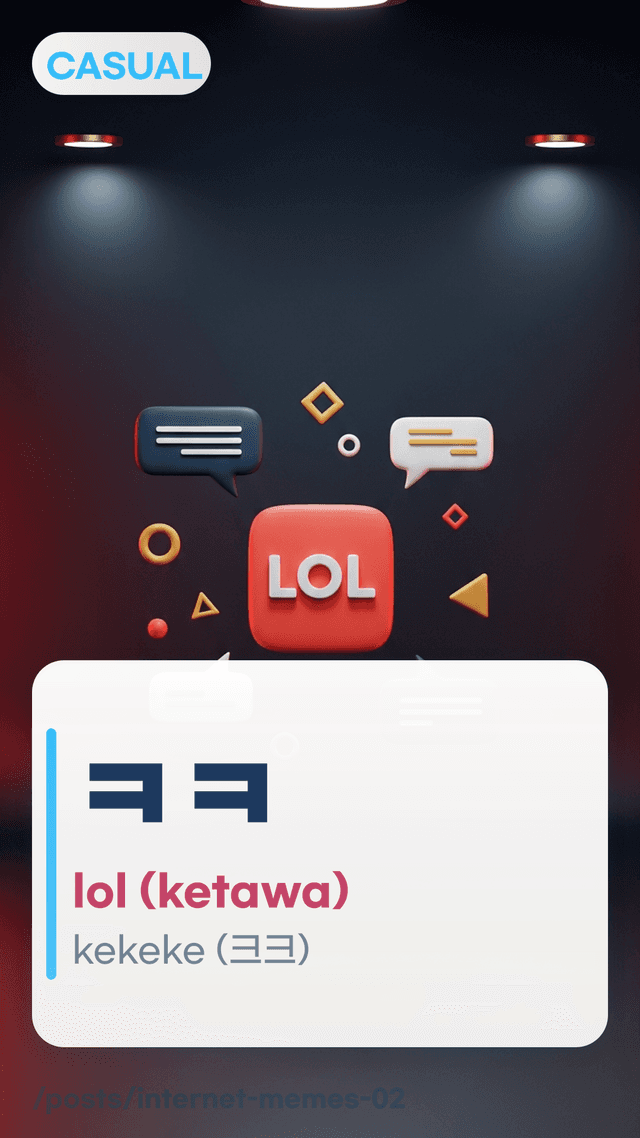 ㄹㅇrieol ialah “real/serius” (리얼), dan ㄹㅇㅋㅋㄹㅇㅋㅋ bermaksud “serius lol.” Ia untuk situasi yang memang benar dan kelakar, atau terlalu mengarut sampai anda tak boleh tahan ketawa.