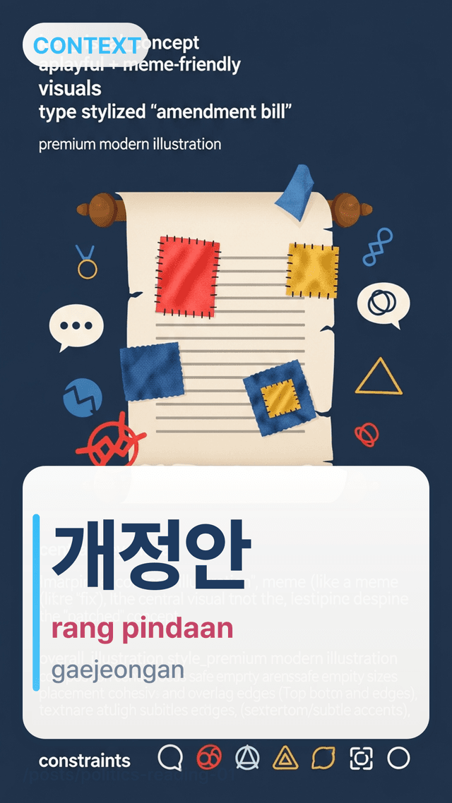 개정안gaejeoan merujuk kepada perubahan yang dicadangkan, dan tajuk sering memperlakukannya seperti satu “benda yang bergerak melalui beberapa langkah.” Perangkap biasa ialah membacanya sebagai “undang-undang sudah dipinda,” sedangkan ia mungkin masih dalam semakan.
