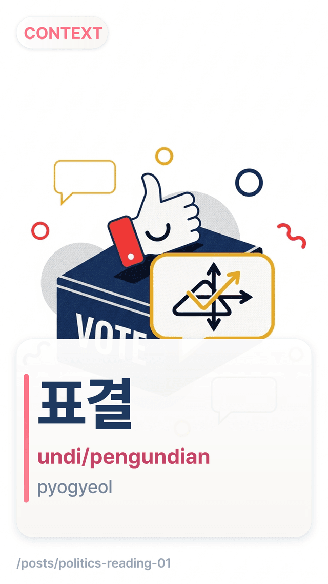 표결pyogyeol ialah tindakan (atau konteks hasil) mengundi, dan tajuk menggunakannya untuk membingkaikan titik keputusan. Satu lagi perangkap ialah menyangka ia bermaksud “semua orang mengundi” secara dramatik; ia boleh merujuk kepada undian rutin, dan hasilnya mungkin tidak jelas melainkan anda nampak perkataan seperti 가결gagyeol (passed) atau 부결bugyeol (rejected).